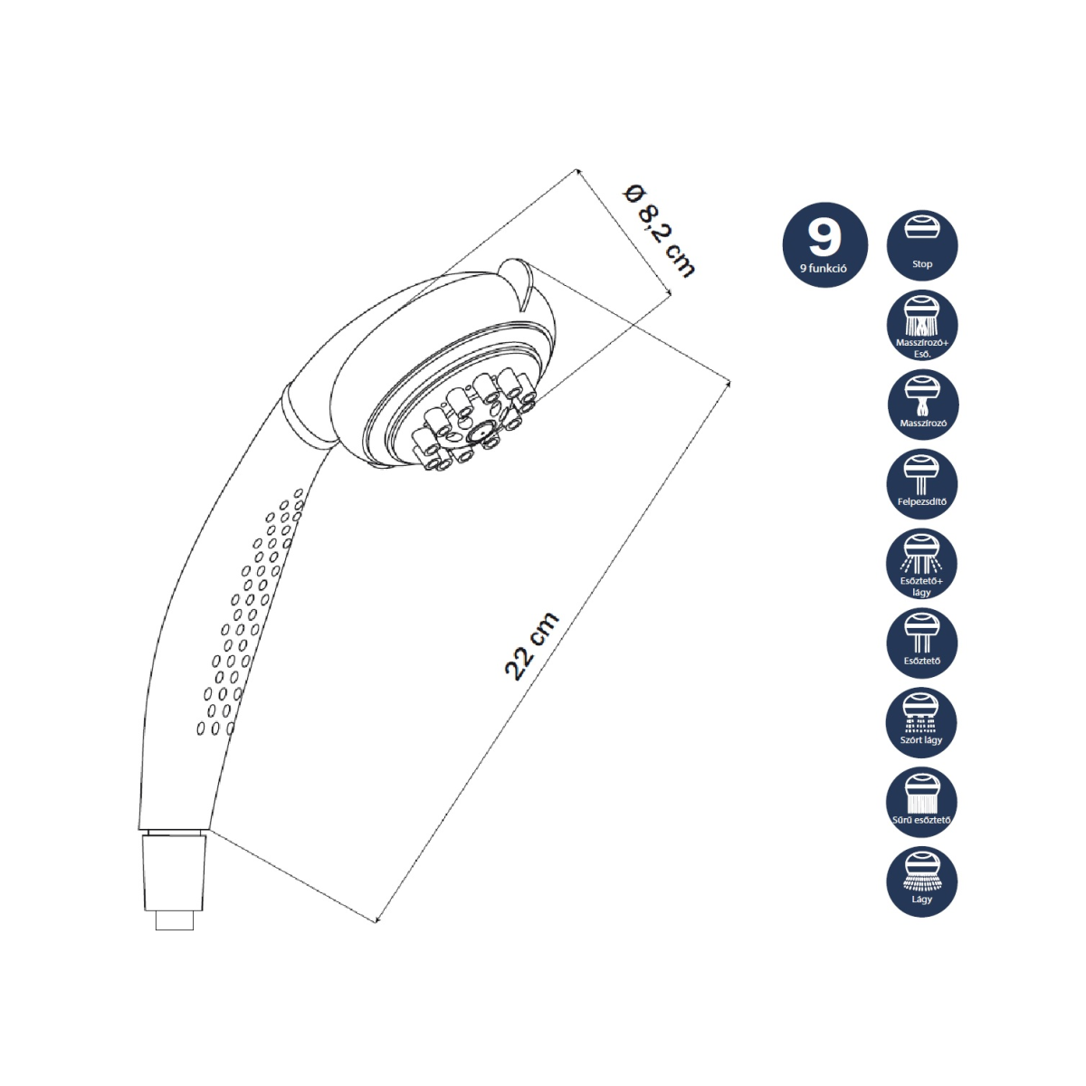 9 funkciós, szilikonbetétes, víztakarékos zuhanyfej stop állással; gőzkrómozott műanyag. Ezzel a zuhanyfejjel a zuhanyzás feltöltődést nyújthat mindenki számára.