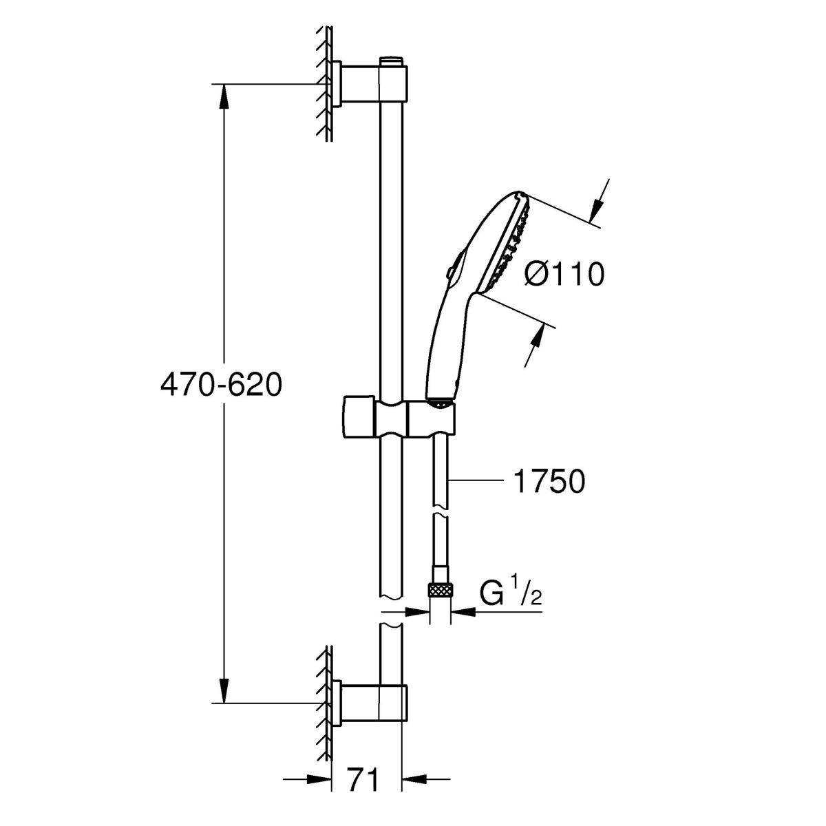A Grohe Vitalio Start 110 zuhanyszett praktikus és modern megoldást kínál, amely tartalmaz egy kézizuhanyt két vízsugár-funkcióval, egy 600 mm-es zuhanyrudat, valamint egy 1750 mm-es zuhanytömlőt. A GROHE innovatív technológiáinak köszönhetően a szett víztakarékos, könnyen tisztítható és hosszabb élettartamú kialakítással rendelkezik.