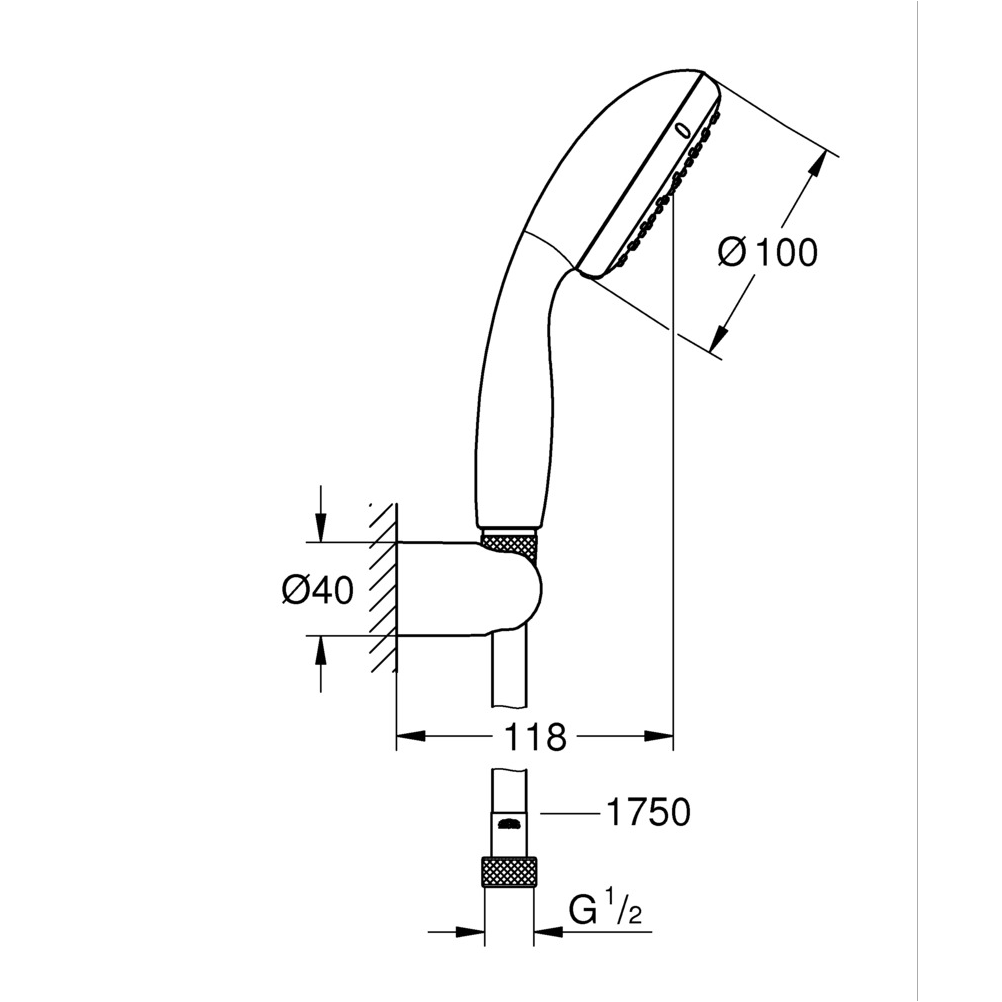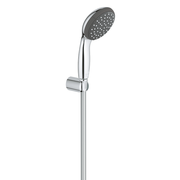 Grohe Vitalio Start zuhanyszett, Vitalio Start kézi zuhanyfej, átmérő: 100 mm, állítható vízsugár: két funkció, Grohe DreamSpray szóráskép, maximális átfolyási mennyiség: 5,7 l/perc, Grohe StarLight krómfelület, SpeedClean vízkőmentesítő rendszer, ShockProof védő szilikongyűrű, átfolyós vízmelegítőkhöz alkalmas, Vitalio Universal fali tartó, Vitalioflex Trend gégecső, 1,75 m 1/2"x1/2"