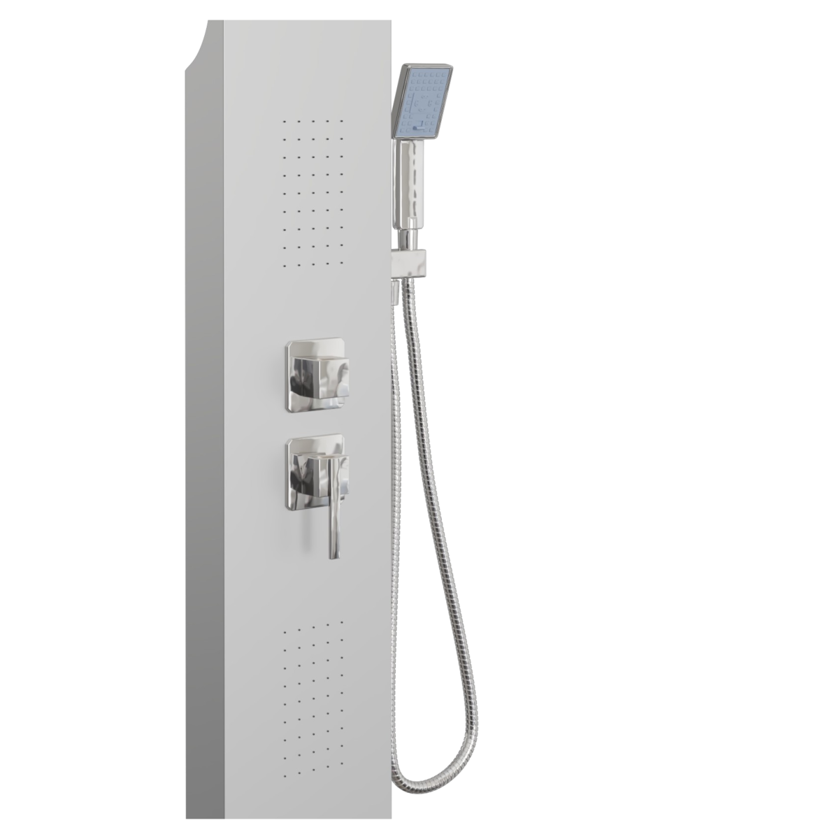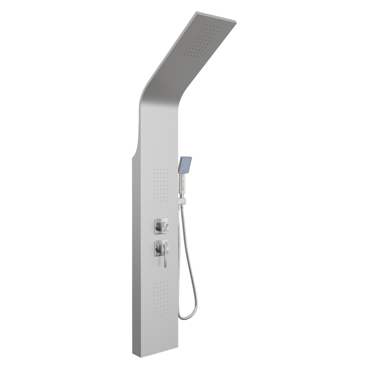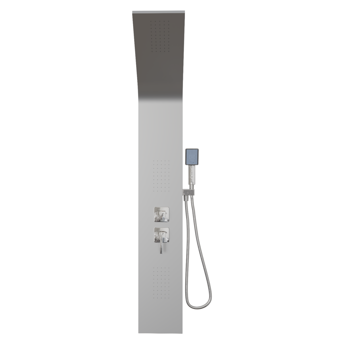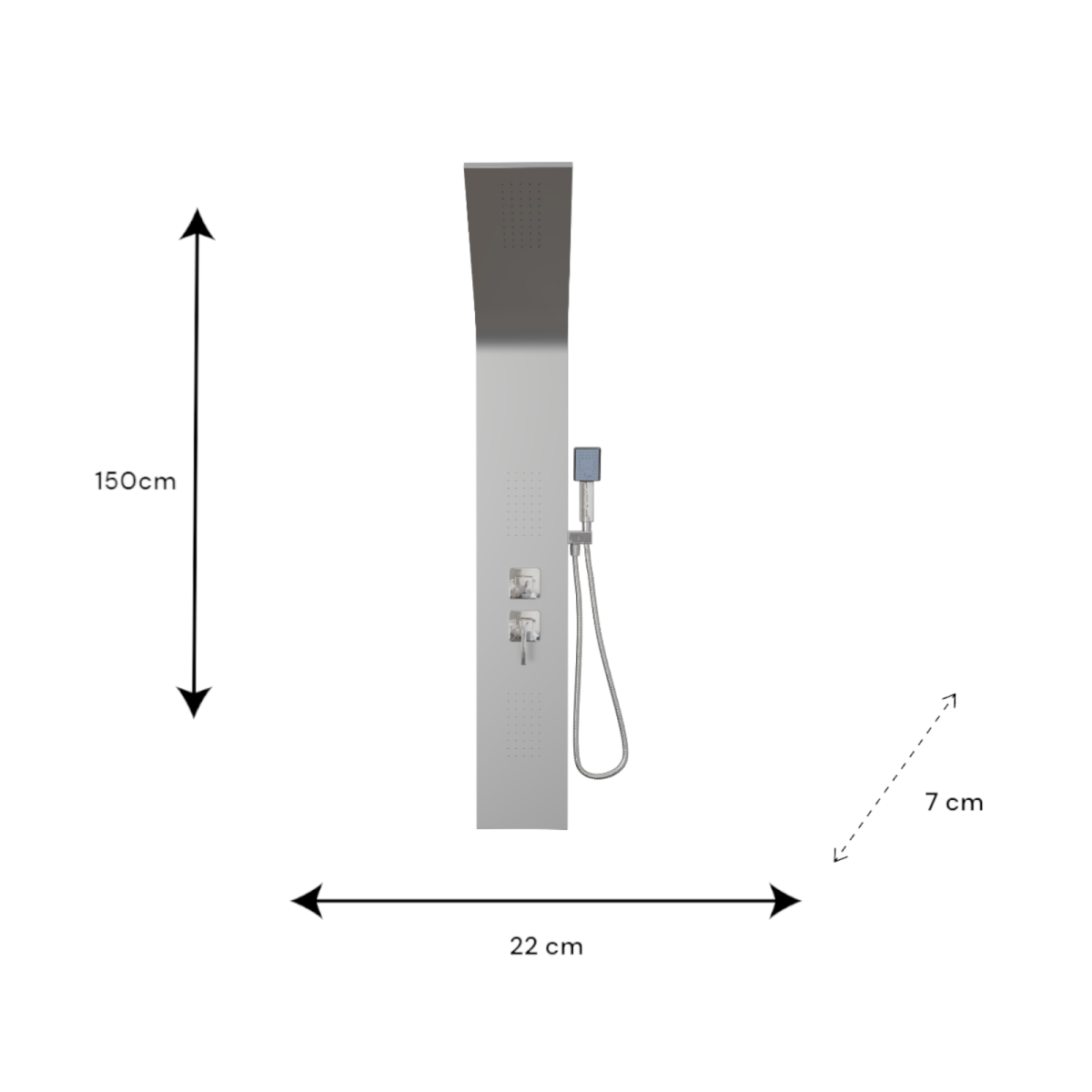 A 150×22 cm-es méretű, szálcsiszolt ezüst színű alumíniumból készült zuhanypanel modern megjelenésével és praktikus funkcióival ideális választás fürdőszobádba. Két nagyméretű fix hidromasszázs fúvóka gondoskodik a kellemes víznyomásról, míg a kerámia betétes keverőszelep és funkcióváltó precíz szabályozást biztosít. A felső esőztető és a kézi zuhany is a mindennapi komfortot szolgálja.