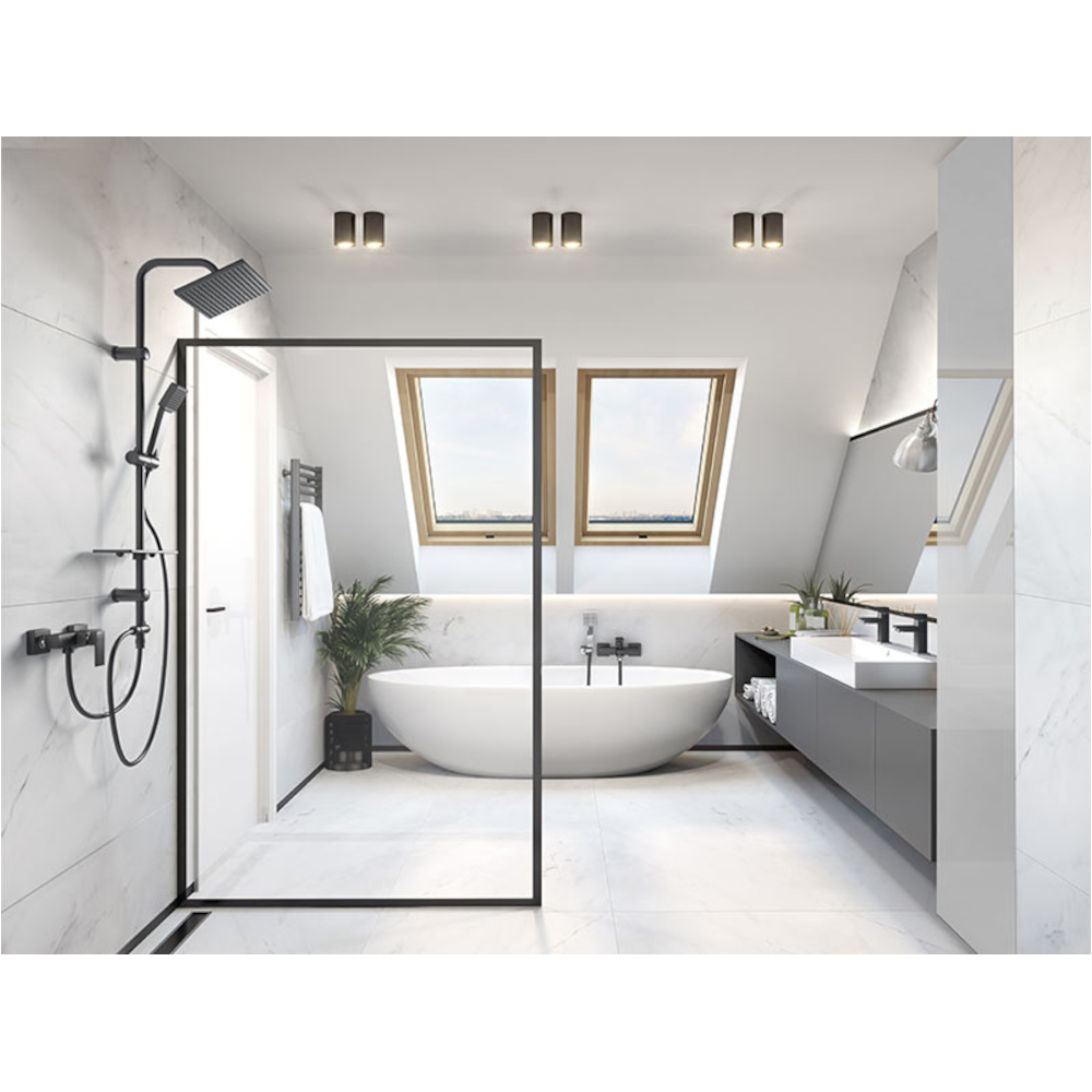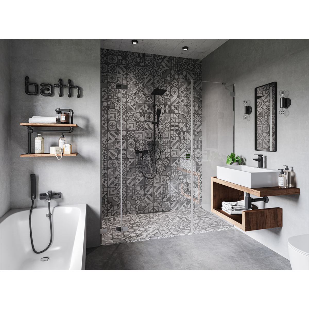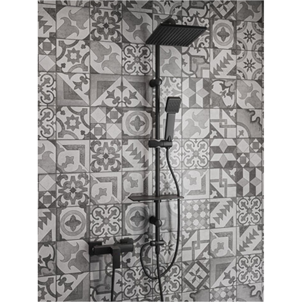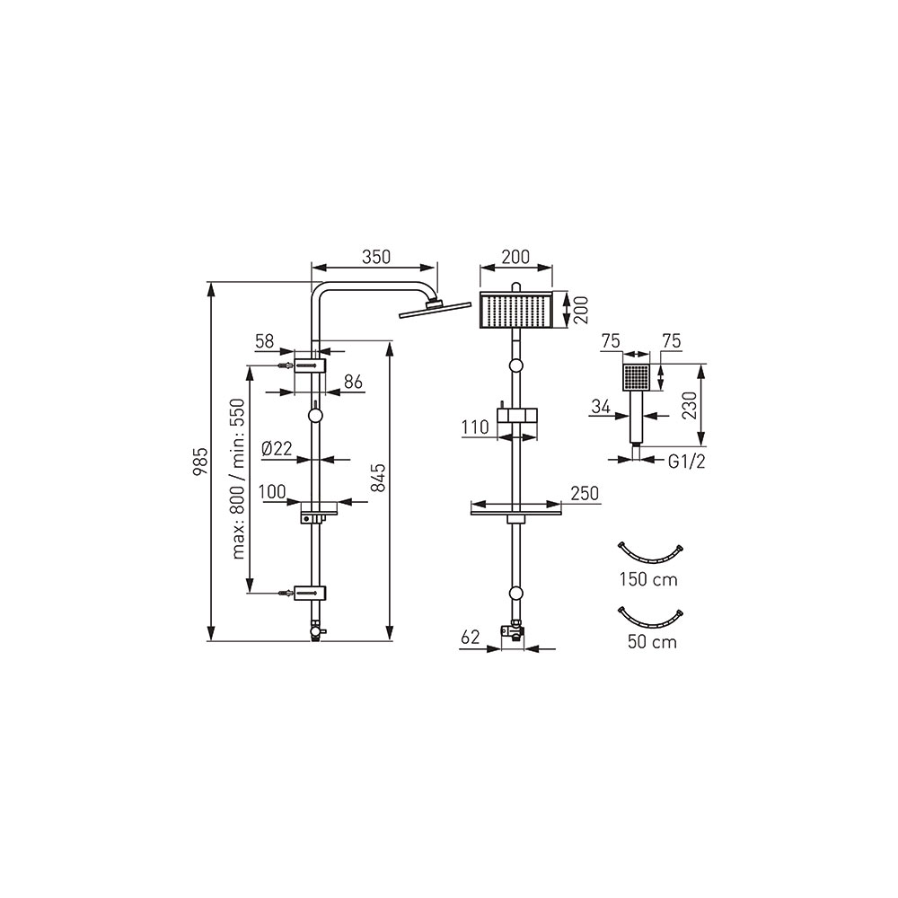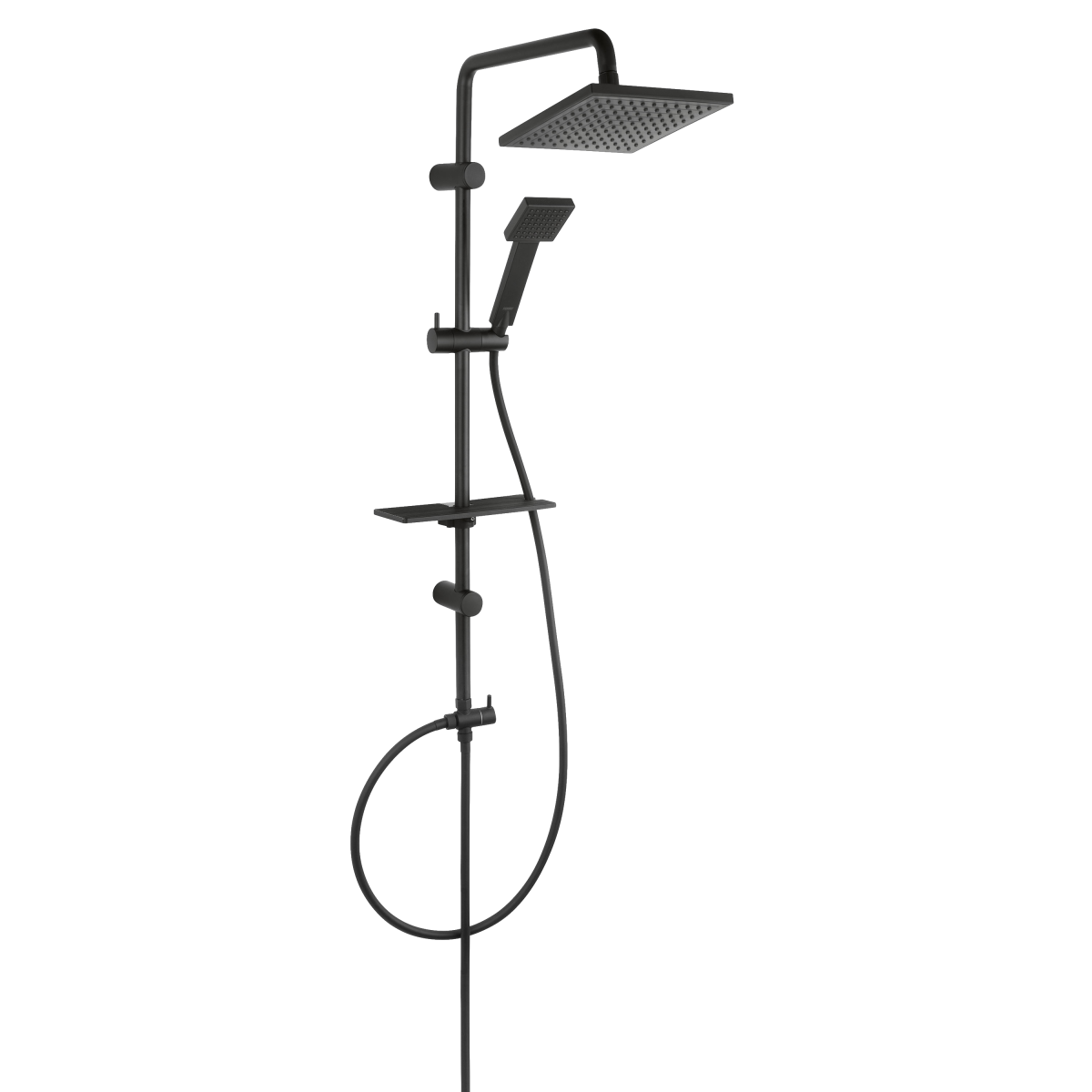 Fém zuhanyrúd 98,5 cm-es méretű. Állítható távolságú rögzítők (a falon már meglévő furatba illeszthető). Fejzuhany mérete 20x20 cm. A kézizuhany 1 funkciós. Easy Clean System könnyű vízkő eltávolítás érdekében. PVC zuhanycső 150 cm-es méretű. PVC csatlakozócső 50 cm-es és 1/2”-es méretű (univerzális minden kád- és zuhanycsaptelephez). Fém zuhanyváltó kerámiabetéttel. Praktikus állítható polc a kozmetikumokhoz.