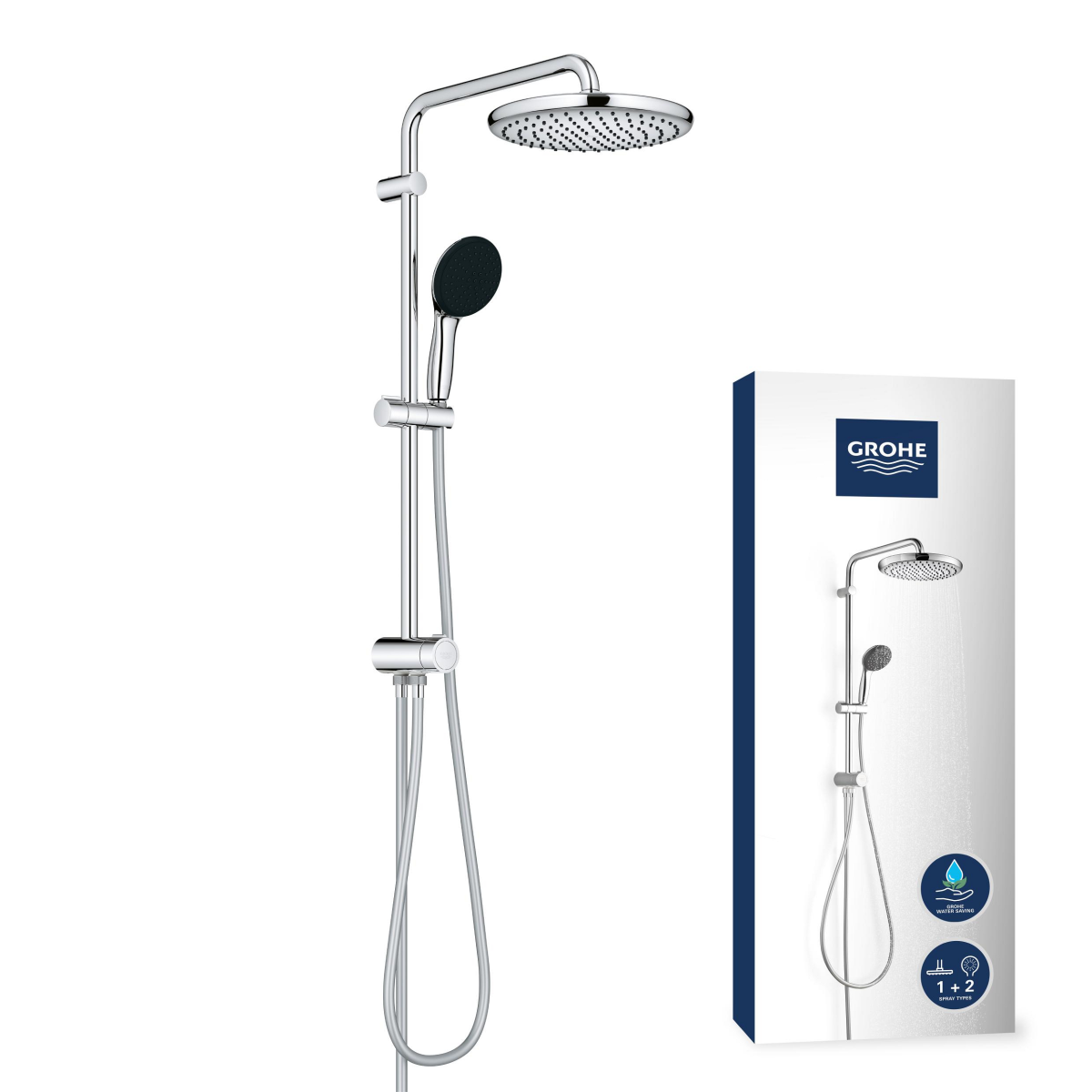 A Grohe Vitalio Start 250 Flex zuhanyrendszer stílusos és funkcionális megoldást kínál fürdőszobádhoz. A rendszer tartalmaz egy 250 mm-es fejzuhanyt és egy 110 mm-es kézizuhanyt, amelyek többféle vízsugár-funkcióval rendelkeznek. A diverter segítségével könnyedén válthatsz a kézizuhany, a fejzuhany Rain üzemmódja és az Eco funkcióval ellátott SmartRain között.