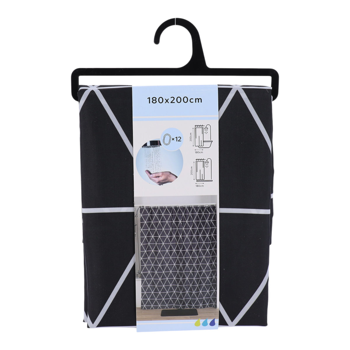 Zuhanyfüggöny poliészter 180 × 200 cm fekete-fehér geometriai mintával, 12 karikával