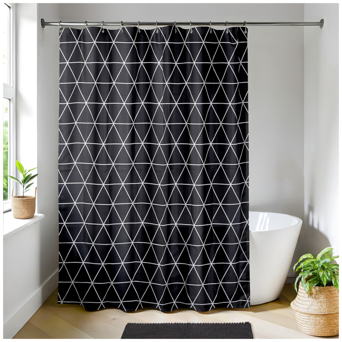 Ez a fekete-fehér geometriai mintás poliészter zuhanyfüggöny stílusos és praktikus megoldás a rendezett, száraz fürdőszobáért.