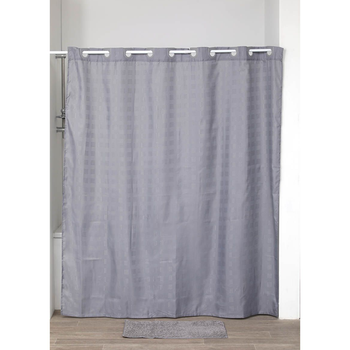Ez a szürke, kockás poliészter zuhanyfüggöny praktikus és esztétikus megoldás, amely segít szárazon és rendezetten tartani a fürdőszobát.