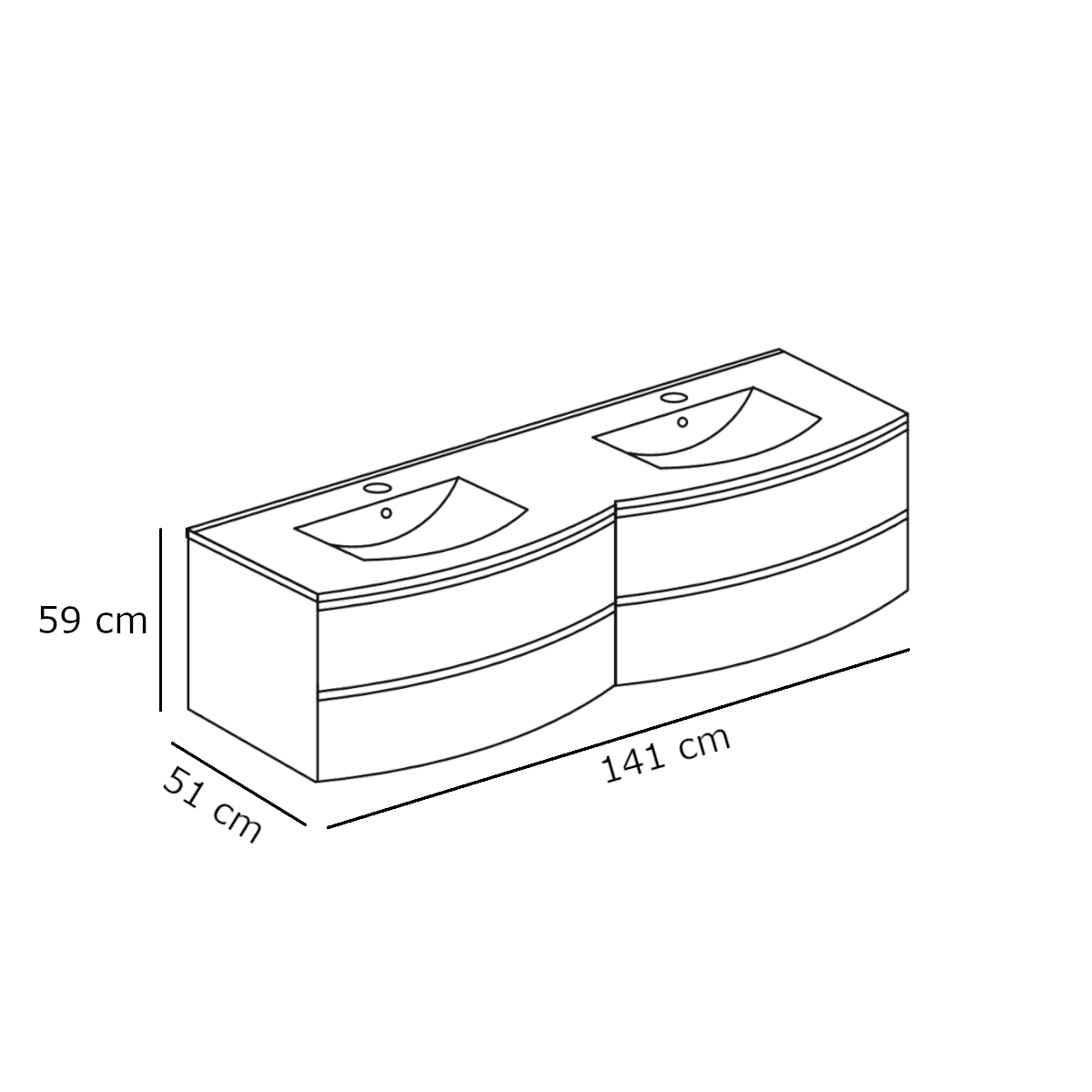 A bútor otthoni szerelést igényel. A műmárvány dupla mosdó 35 mm-es csaplyukkal ellátott, és közvetlenül a bútorra illeszthető.