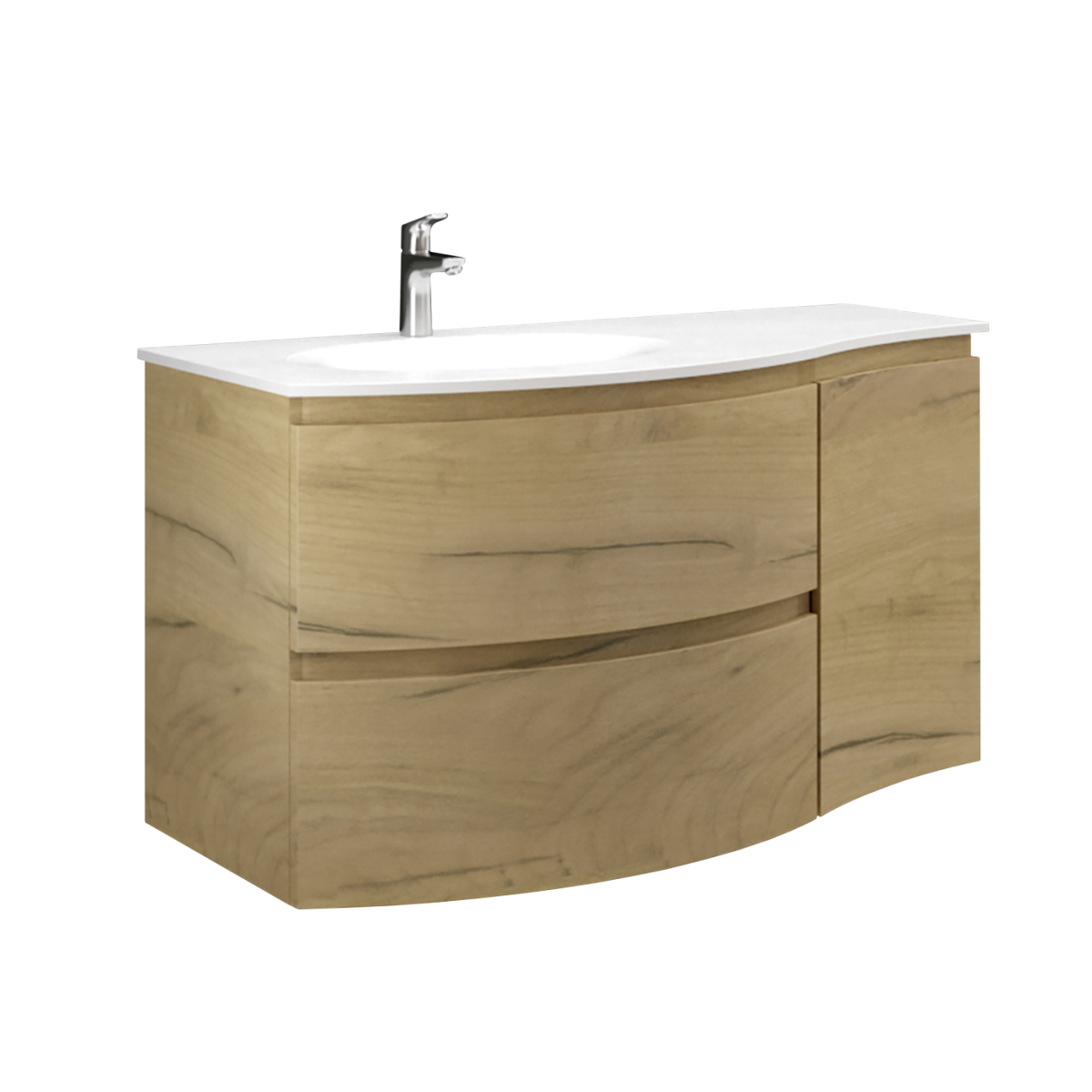 Az Armonia arany tölgy színű mosdós alsószekrény különleges formavilágával és praktikus kialakításával stílusos központi eleme lehet fürdőszobádnak.