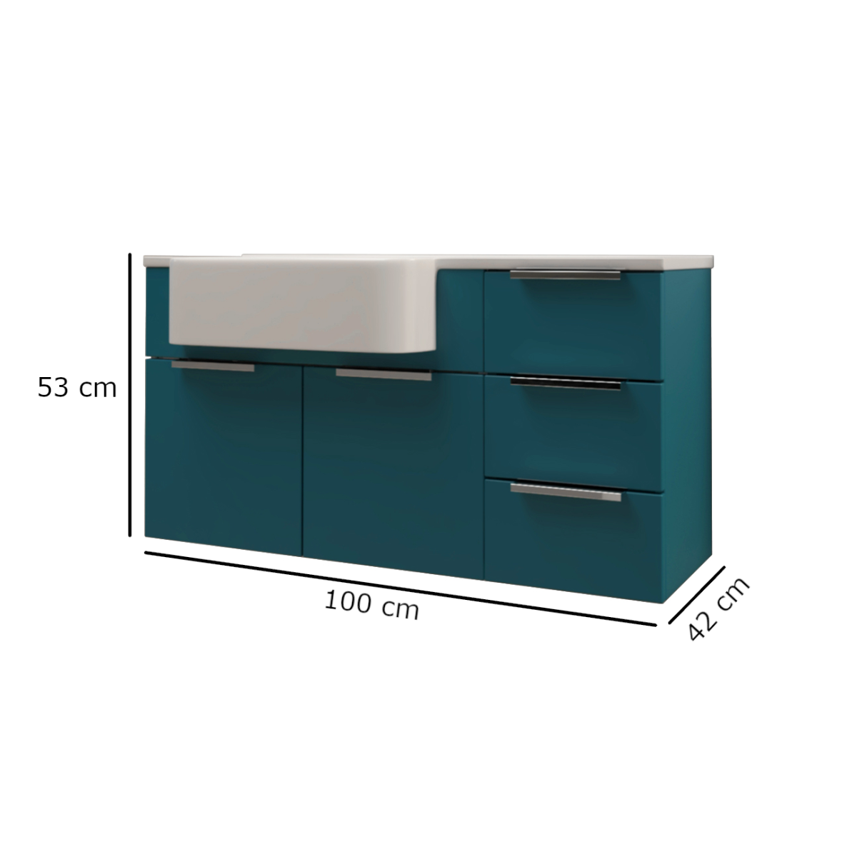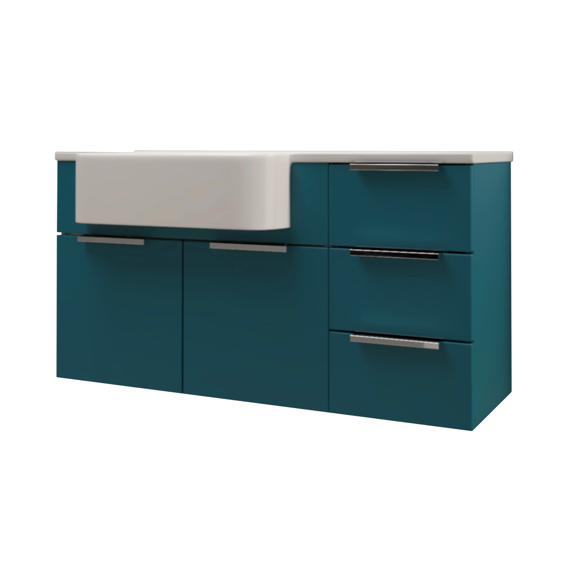 Az elegáns olajkék front kiemeli az enteriőr karakterét, a csillapított záródású ajtók és fiókok pedig halk, kényelmes használatot nyújtanak. A beépített műgyanta mosdó könnyen tisztítható és tartós választás.
