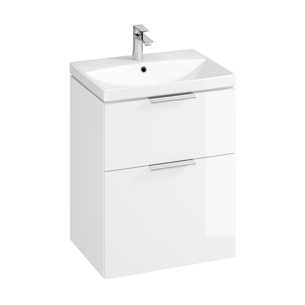 A fehér, mosdóval egybeépített alsószekrény elegáns és funkcionális megoldás a fürdőszobába. Fehér, lakkozott forgácslapból készült szerkezete matt króm fogantyúkkal egészül ki, amely modern, visszafogott stílust kölcsönöz. A két lágy záródású fiók közül a felső kettéosztott, alacsonyabb magasságú, míg az alsó tágasabb tárolóhelyet biztosít. A hozzá tartozó City 60 kerámiamosdó nagyméretű tárolóperemmel, központi túlfolyóval és csaplyukkal rendelkezik.