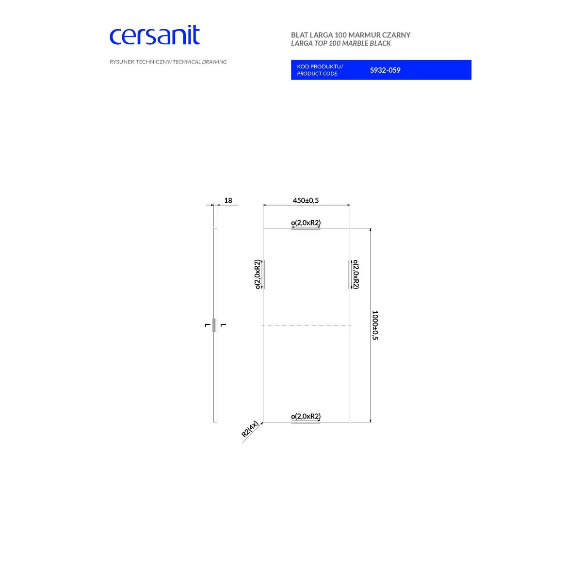 Cersanit Larga 100×1,8×45 cm fekete márványmintás, impregnált forgácslap mosdólap – furatok és kivágások nélkül, a Cersanit Larga bútorcsaládhoz illeszthető kivitelben.