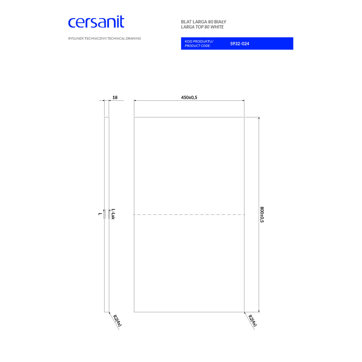Cersanit Larga 80×1,8×45 cm fehér, impregnált MDF mosdólap – furatok és kivágások nélkül, a Cersanit Larga bútorcsaládhoz illeszthető kivitelben.