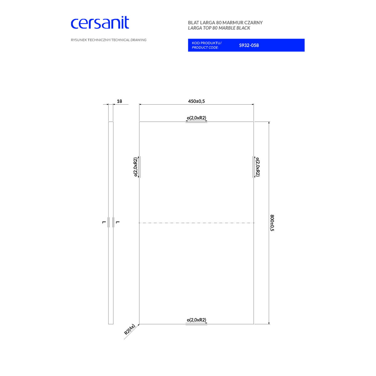 Cersanit Larga 80×1,8×45 cm fekete márványmintás, impregnált forgácslap mosdólap – furatok és kivágások nélkül, a Cersanit Larga bútorcsaládhoz illeszthető kivitelben.