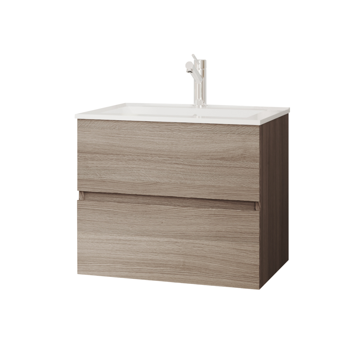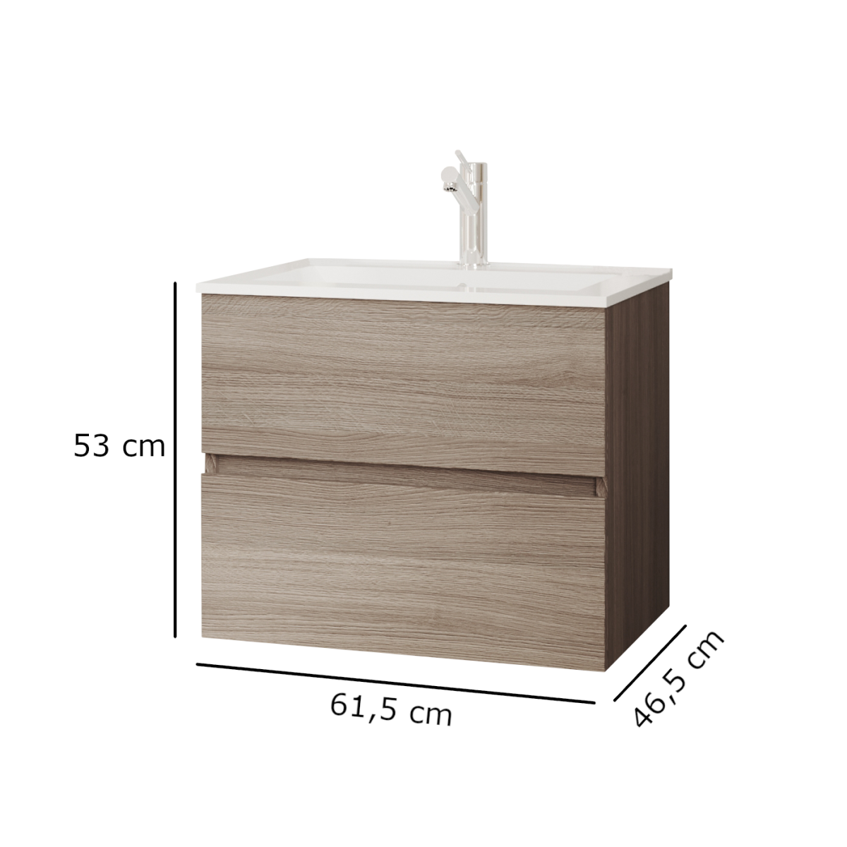 A 61,5 cm széles, két csillapított záródású fiókkal ellátott bútor halk és kényelmes használatot kínál, míg a vákuumpréselt front tartósabb felületet biztosít. A kerámia mosdó higiénikus, könnyen tisztítható, így ideális választás mindennapi használatra.