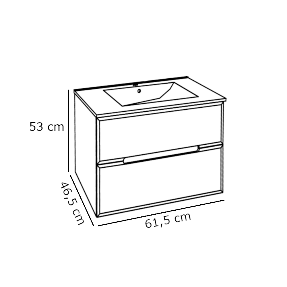 A 61,5 cm széles alsószekrény két csillapított záródású fiókkal rendelkezik, amelyek halk és kényelmes működést biztosítanak. A kerámia mosdó higiénikus és könnyen tisztítható, így ideális választás közepes és nagyobb fürdőszobákba is.