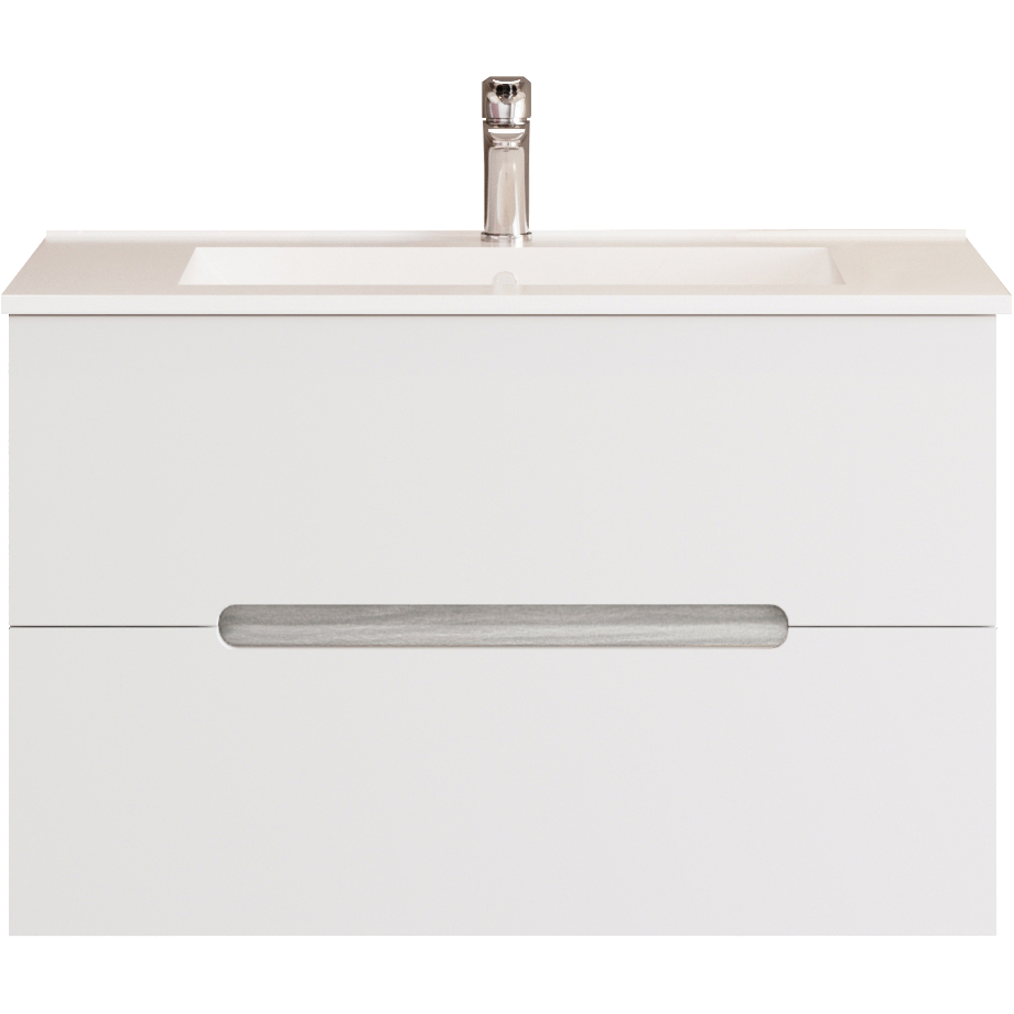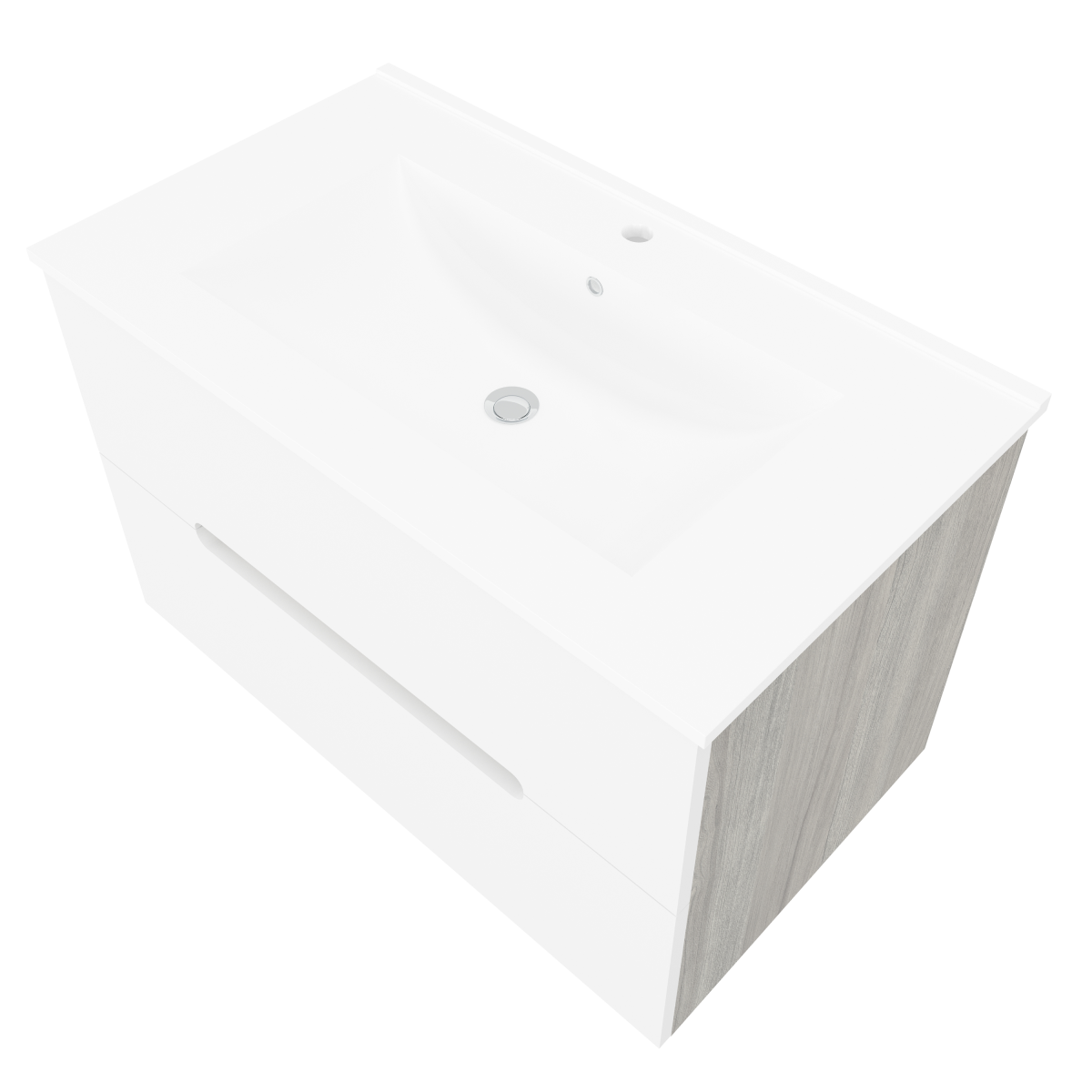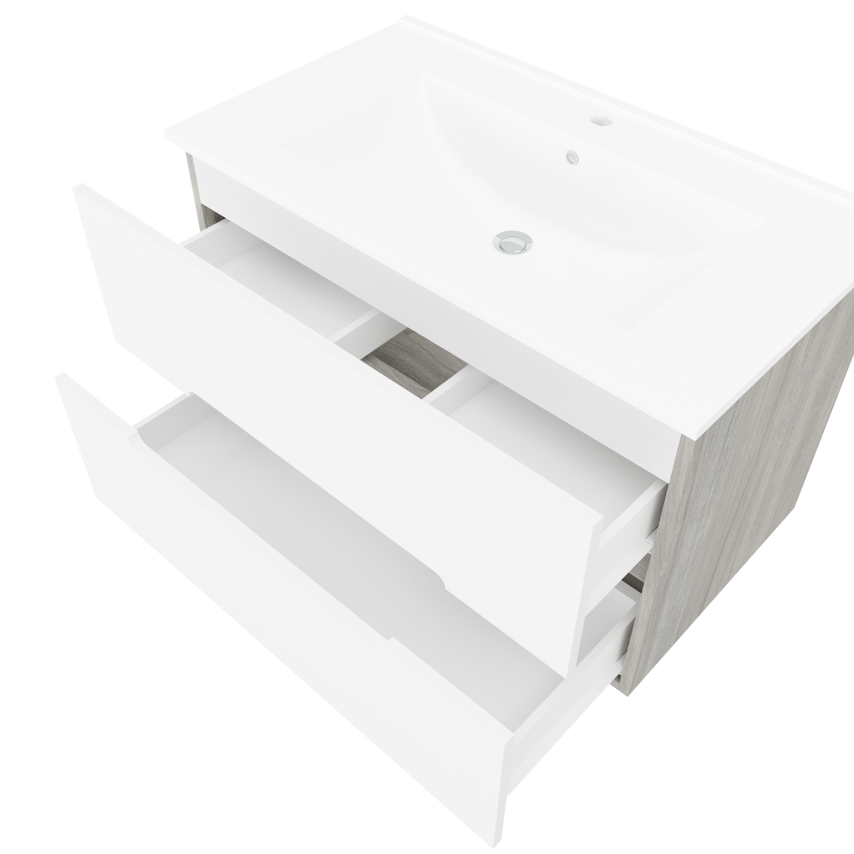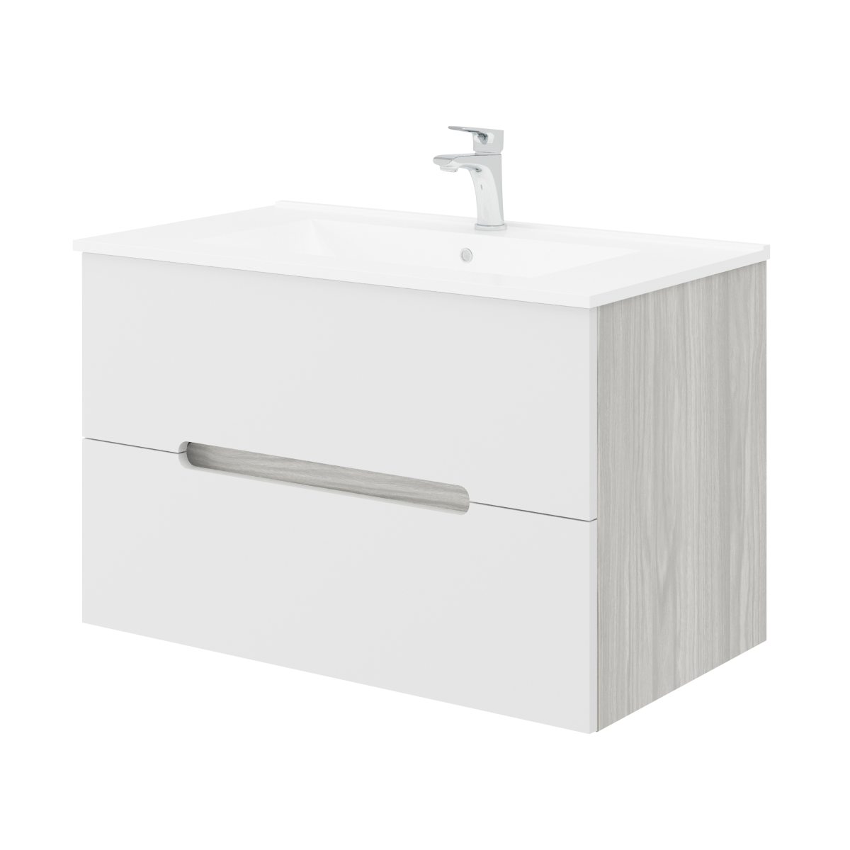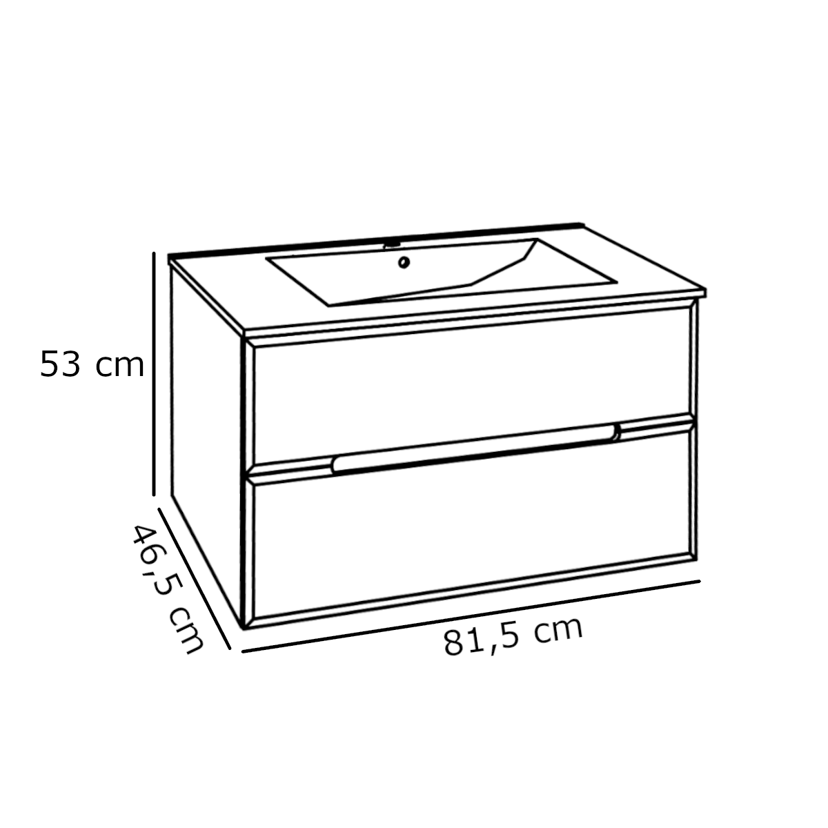 A 81,5 cm széles alsószekrény két csillapított záródású fiókkal rendelkezik, amelyek halk és kényelmes működést biztosítanak. A nagyobb kerámiamosdó higiénikus és könnyen tisztítható, így ideális választás közepes és nagyobb fürdőszobákba is.