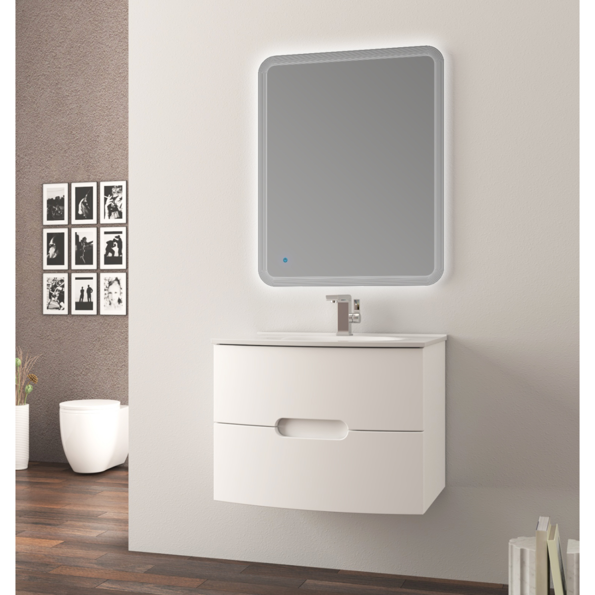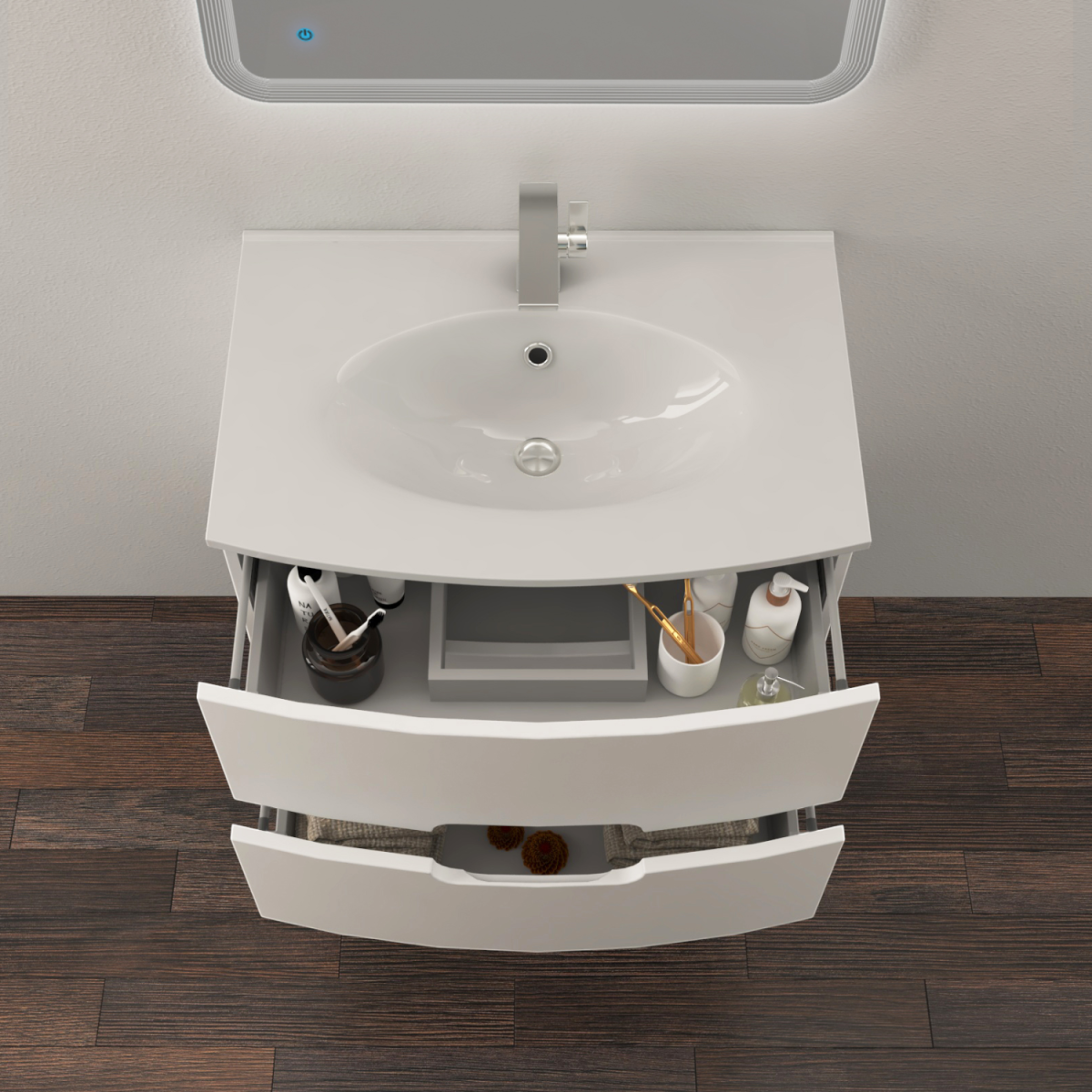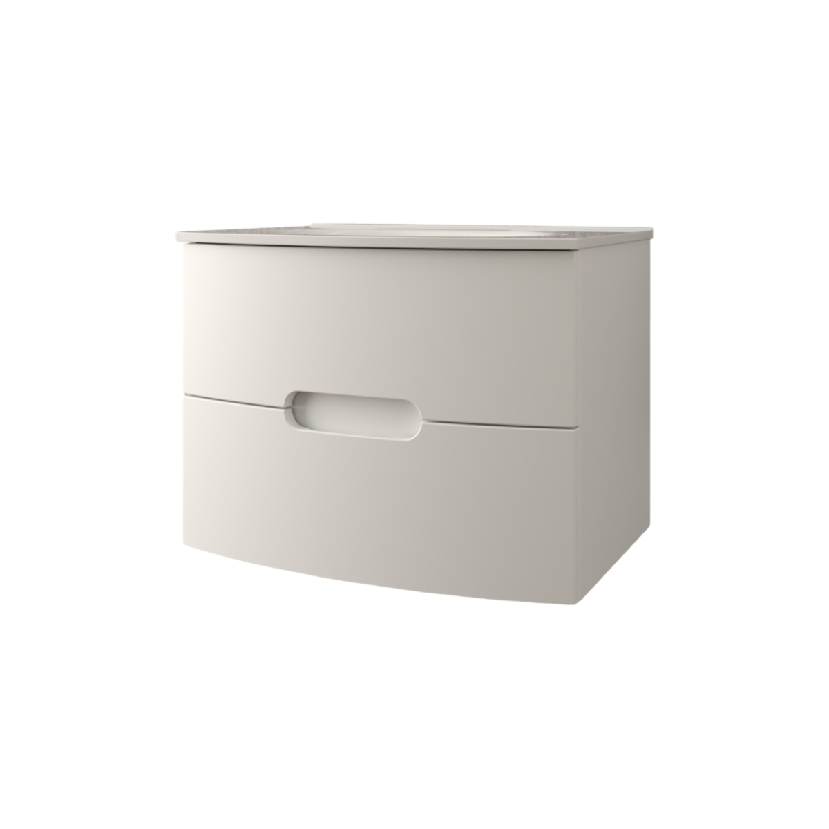 A matt fehér szín elegáns és letisztult hatást kelt, míg a kerámiamosdó higiénikus és könnyen tisztítható felületet biztosít. Két csillapított záródású fiókja halk és kényelmes használatot nyújt, a függesztett kivitel pedig egyszerűbb tisztán tartást tesz lehetővé.