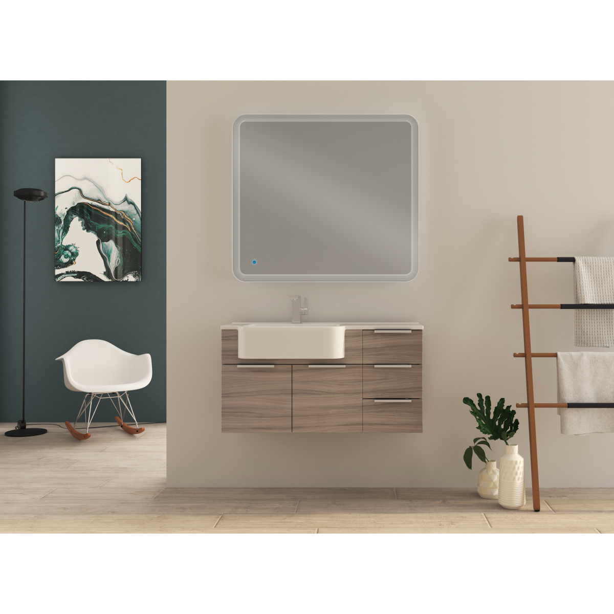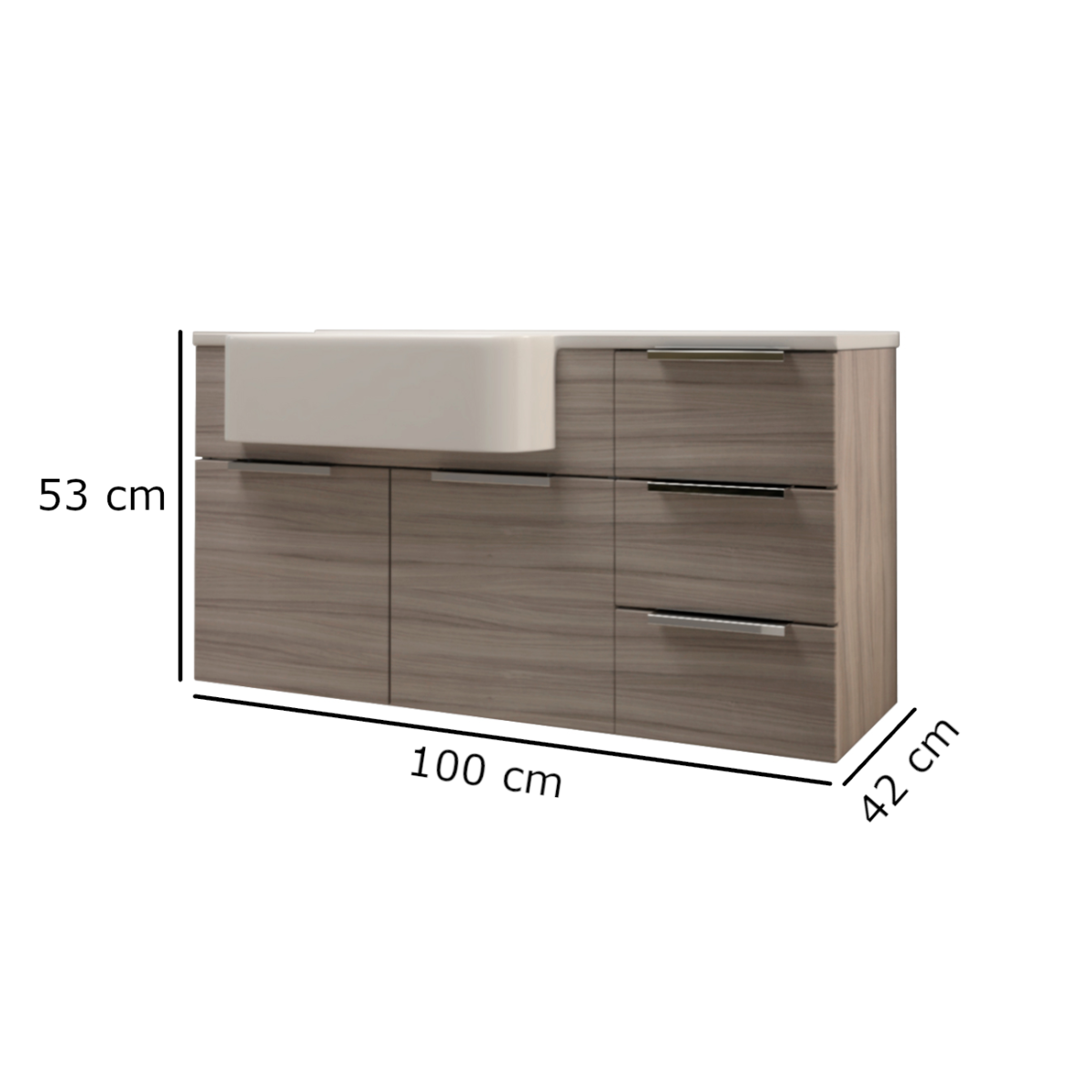 A vörösfenyő szín időtállóbb hangulatot kölcsönöz, a műgyanta mosdó pedig tartós és könnyen tisztítható. A fiókok és ajtók csillapított záródással működnek, így halk és kényelmes a használat.