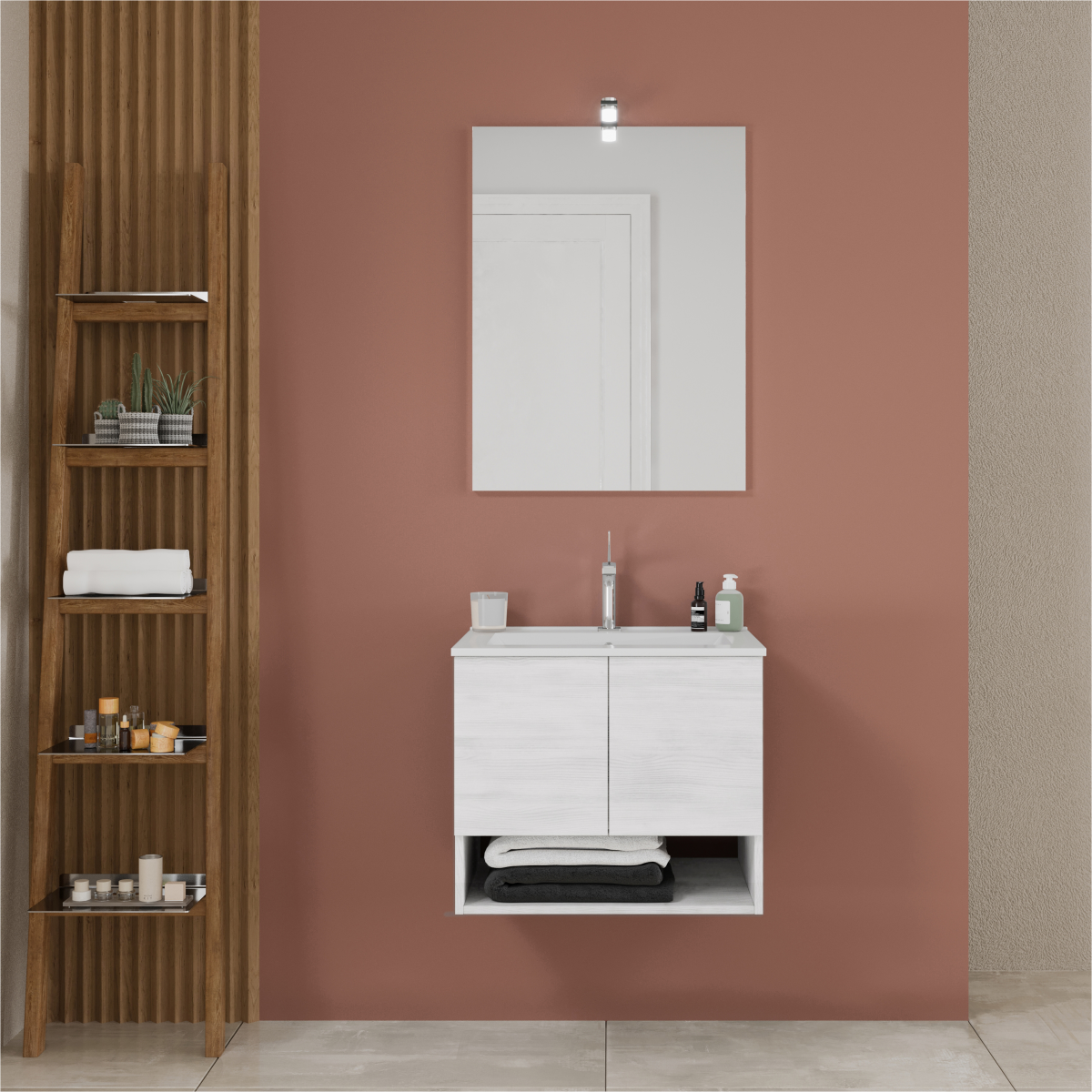 Az Oslo függesztett fehér tölgy alsószekrény mosdóval ötvözi a letisztult megjelenés a praktikus alapfunkciókkal.