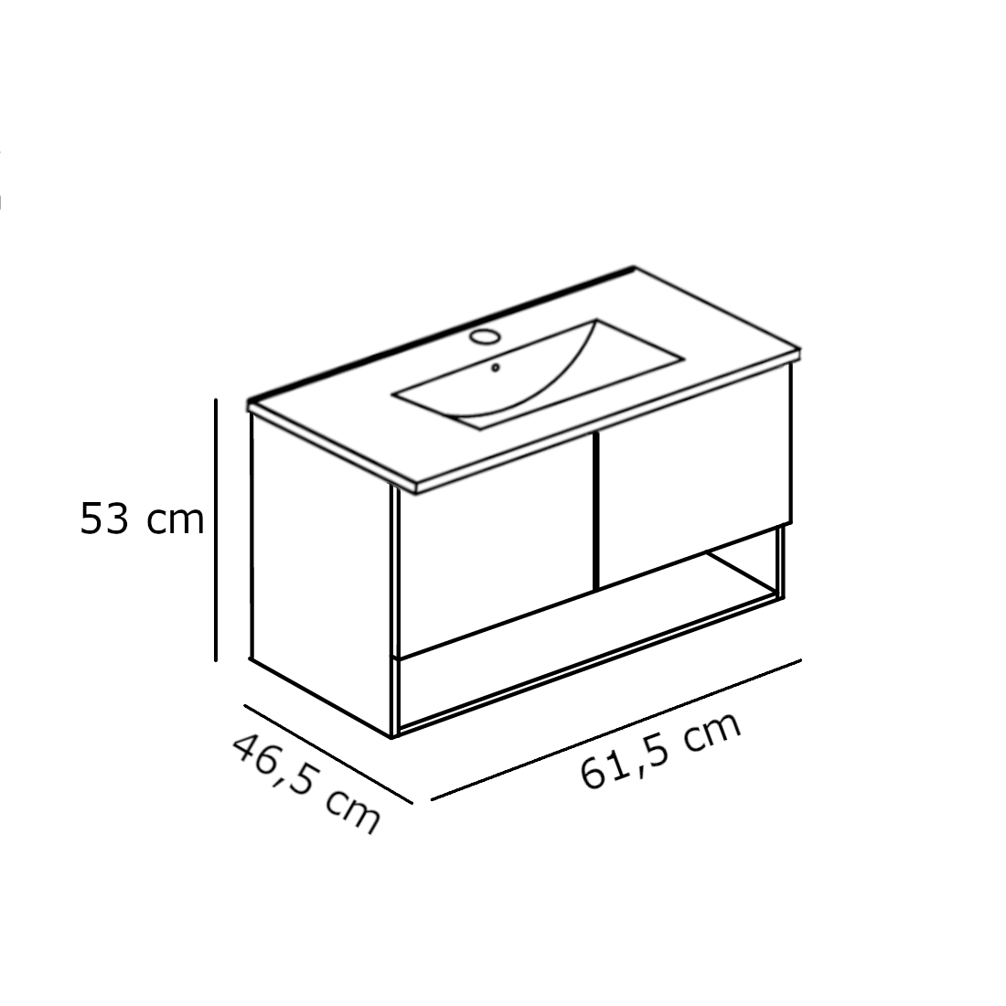 A fehér tölgyfa mintás felületű, forgácslap korpuszú, függesztett alsószekrény két csillapított záródású ajtóval és kerámia mosdóval érkezik. A mosdón a 35 mm-es csaplyuk és a szifonkivágás gyárilag kialakított. Nem lapraszerelt kivitel.