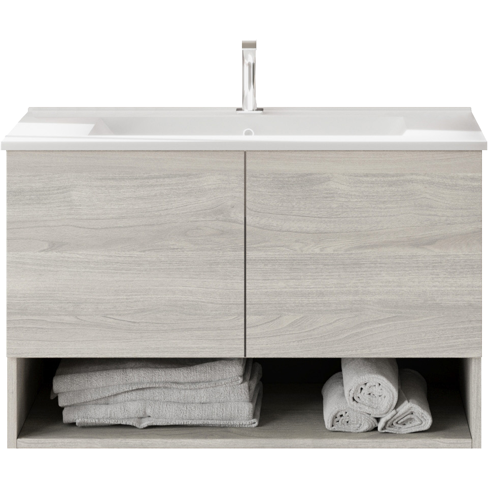 A szürke tölgyfa mintás felületű, forgácslap korpuszú, függesztett alsószekrény két csillapított záródású ajtóval és kerámia mosdóval rendelkezik. A mosdón a 35 mm-es csaplyuk és a szifonkivágás gyárilag kialakított. Nem lapraszerelt kivitel.