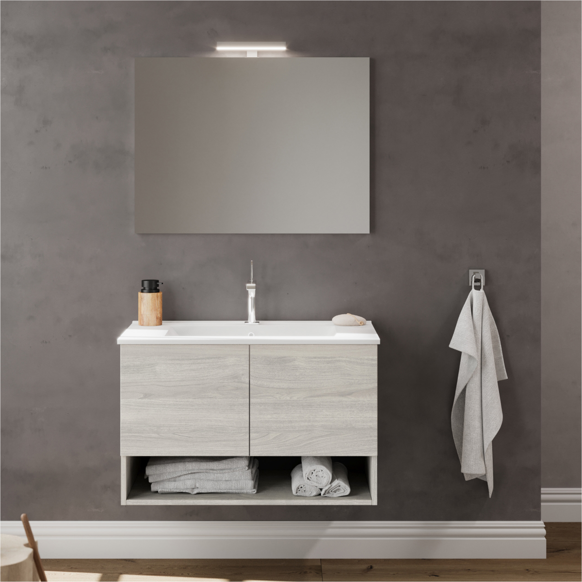 Az Oslo szürke tölgy függesztett alsószekrény mosdóval ötvözi a letisztult megjelenést a praktikus tárolással.