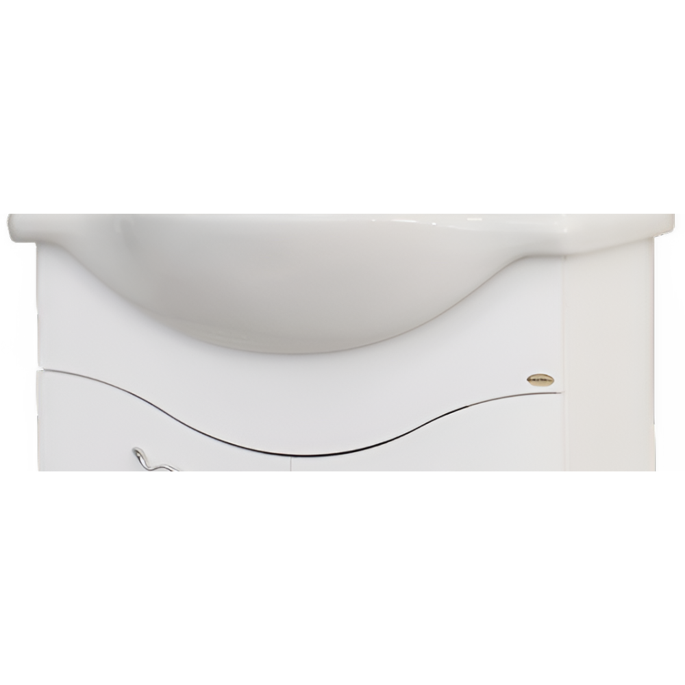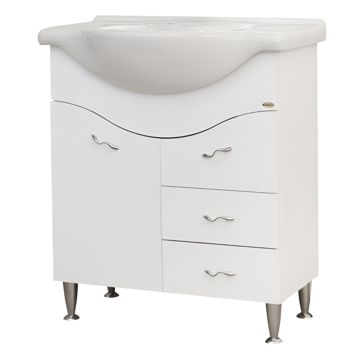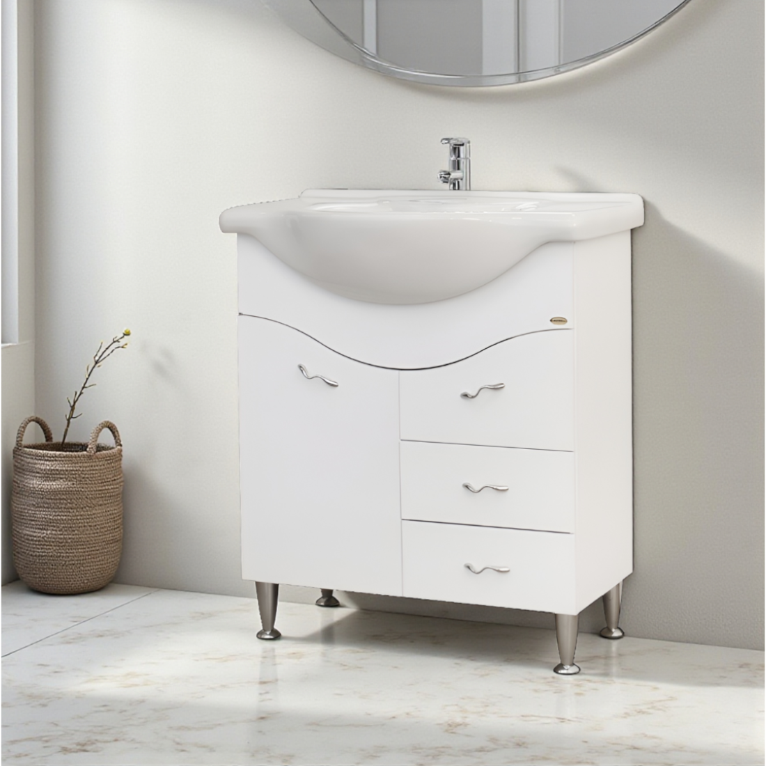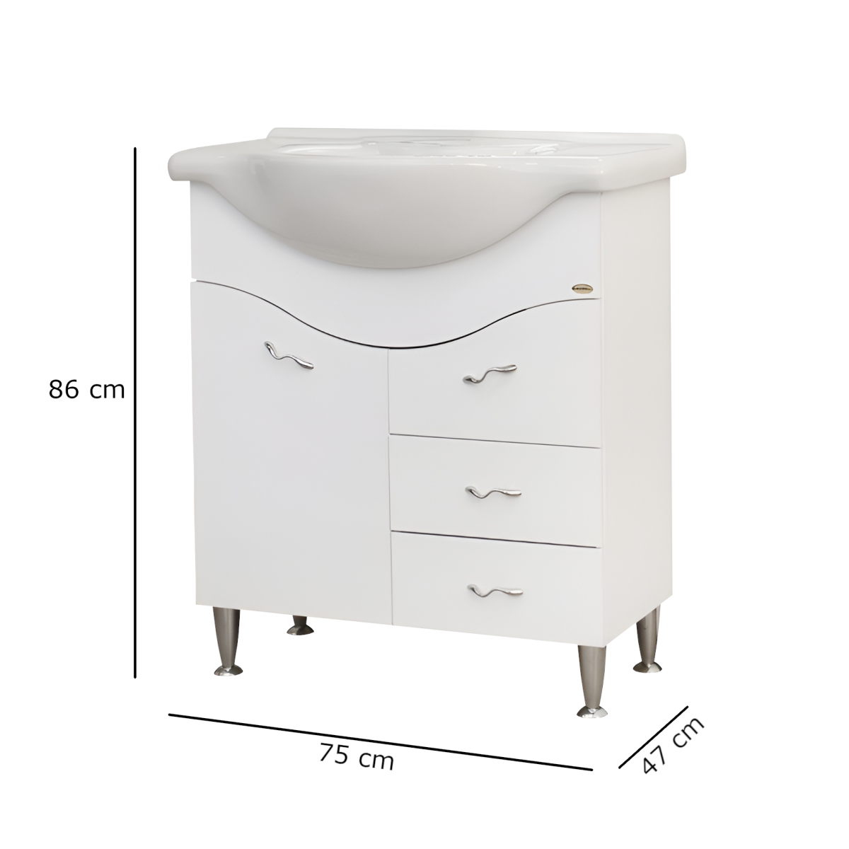 A Rimini 75 letisztult, fehér megjelenésű fürdőszobai alsószekrény a hozzá tartozó kerámia mosdóval egységes, rendezett látványt nyújt. A fiók és a polc praktikus helyet kínál a mindennapi fürdőszobai eszközöknek, így könnyebb rendben tartani a teret.