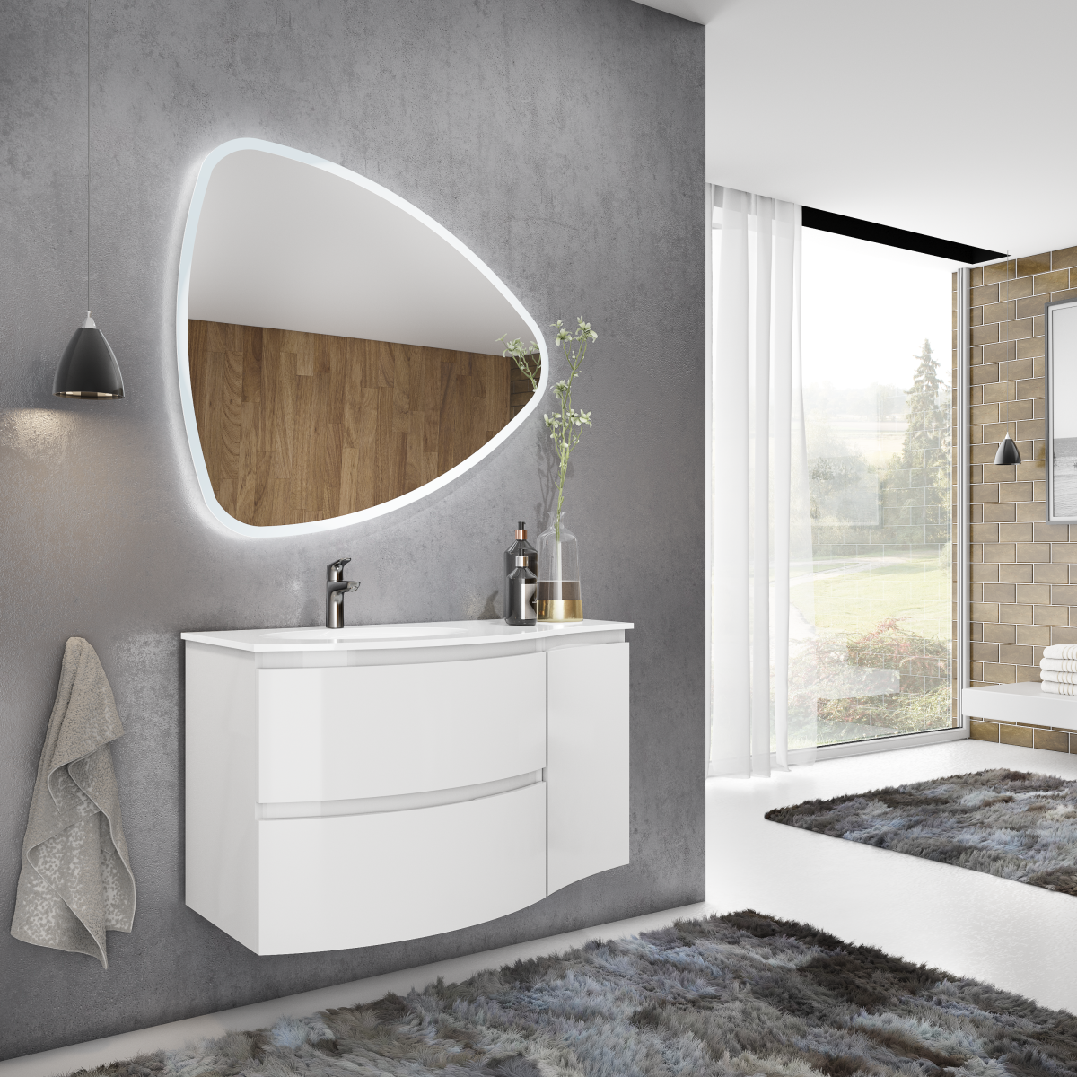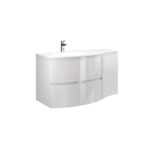 Az egyedi tervezésű Armonia bútor kollekció új koncepciót nyújt ívelt és modern stílusával, így bármely fürdőszoba méltó középpontja lehet. 1 ajtó és csillapított záródású 2 fiók, műmárvány mosdóval, a termék vákuumpréselt fóliázott. Magasfényű fehér színben. Csaptelep nélkül értékesítjük!
