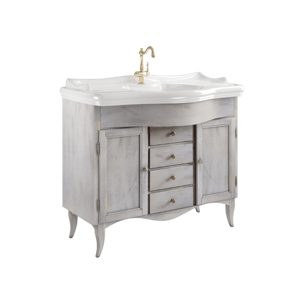 Vintage stílusú fürdőszoba bútor. Frontja tömör nyár fa. 2 ajtós és 4 fiókos. Egyedi tervezésű mosdó, amely a klasszikus vonalakat követi és a nagy perem nem csak hogy elegáns, de praktikus is, mert a vizet visszavezeti a mosdóba.