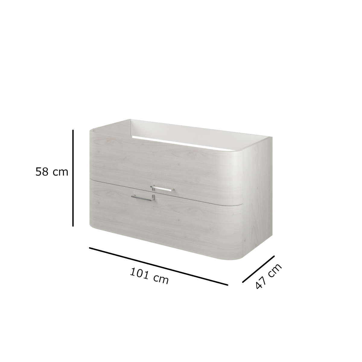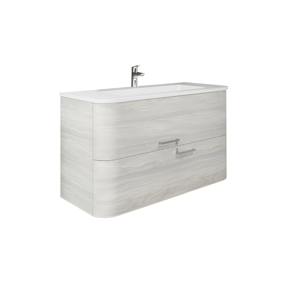 Finom, elegáns megjelenésű, falra szerelhető fürdőszobabútor, amely két, csillapított záródású fiókkal kényelmes tárolási lehetőséget nyújt.