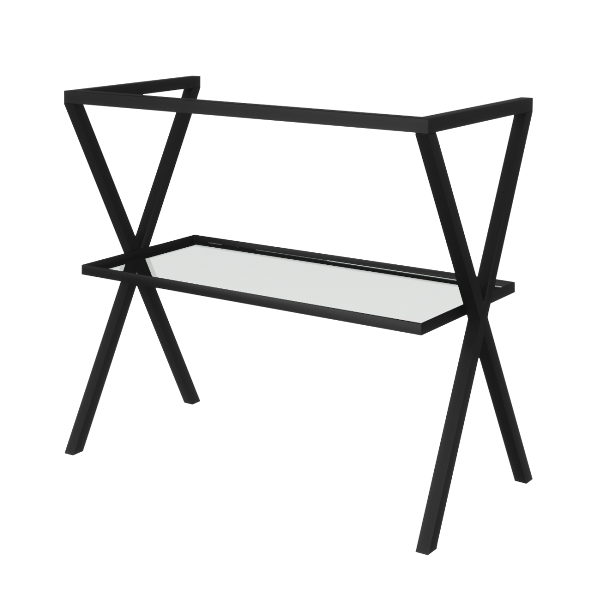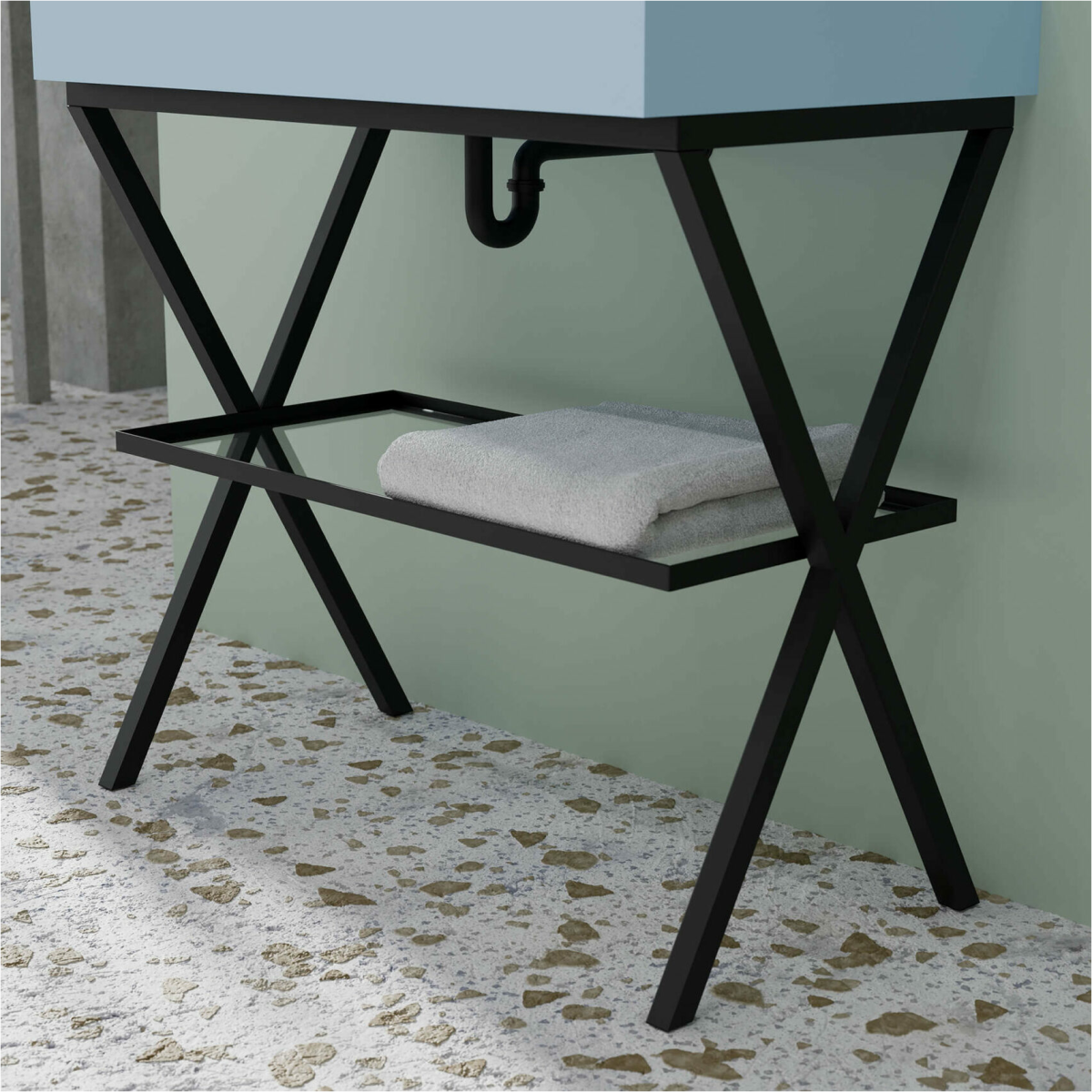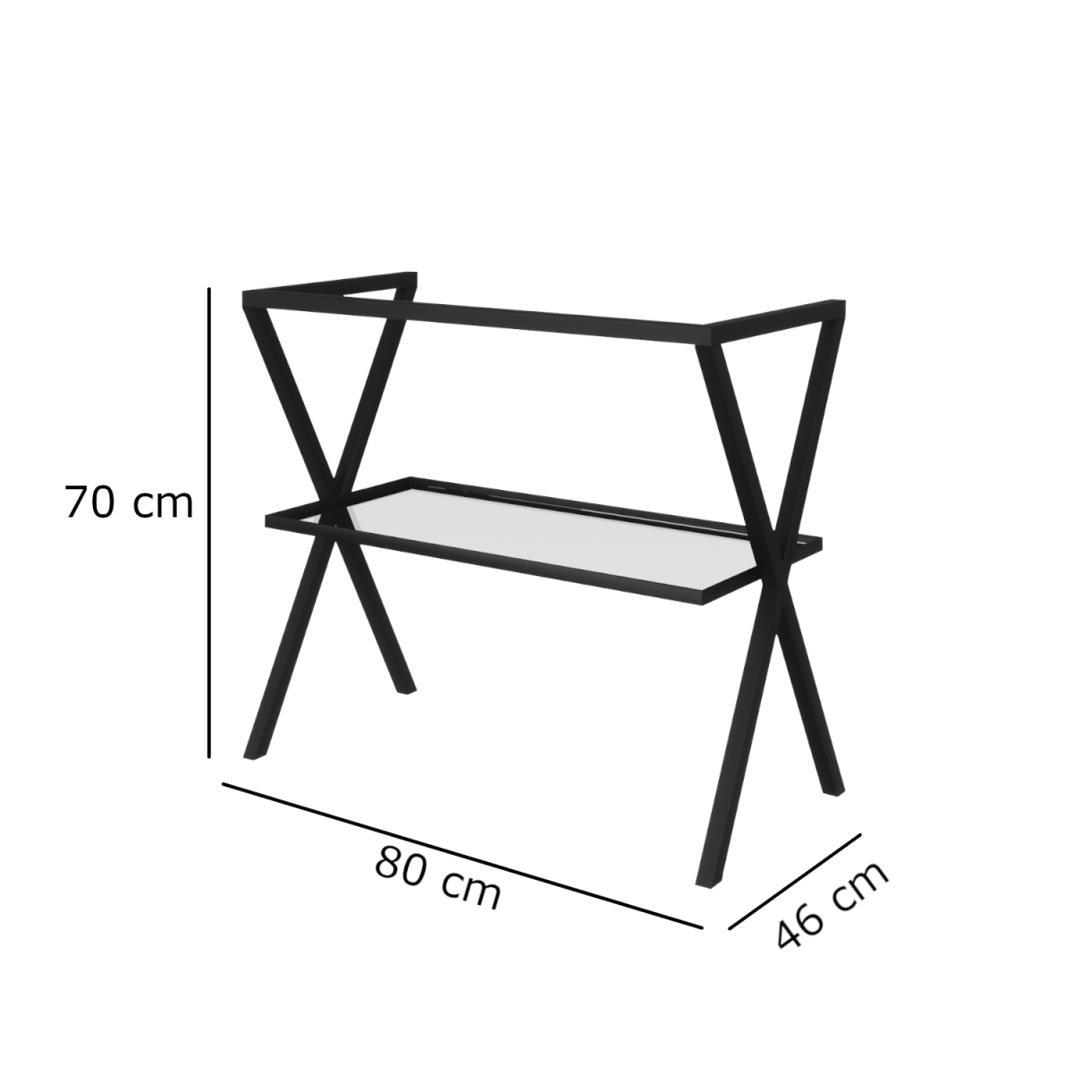 A fekete tartóállvány fémből készült, ami karcsú, esztétikus vázat biztosít, az alsó üvegpolc pedig praktikus pakolófelületet ad a mindennapi eszközöknek. A 80 cm-es szélesség jól használható mosdópultokhoz, a 46 cm mélység pedig kényelmes mozgásteret hagy.