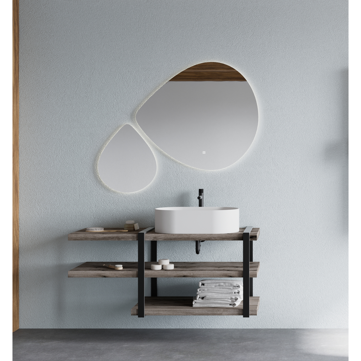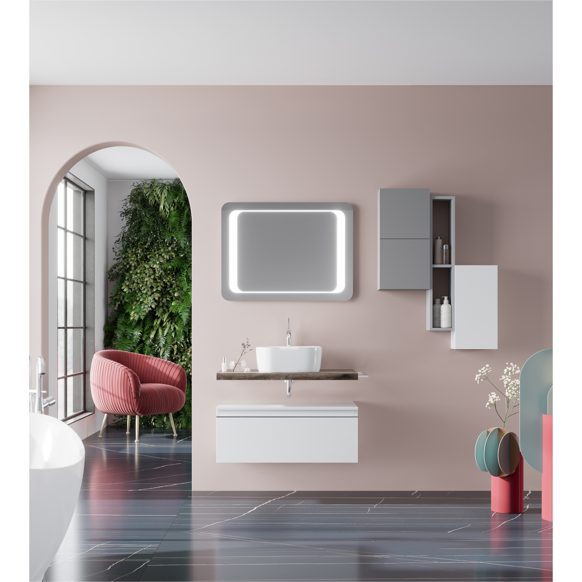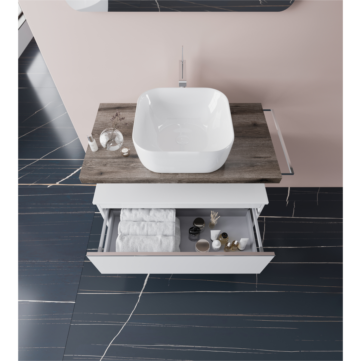 A mosdópult forgácslapból készült, amely ABS élzárással van körben lezárva, így vízállóbb és ellenállóbb a fürdőszobai párának.