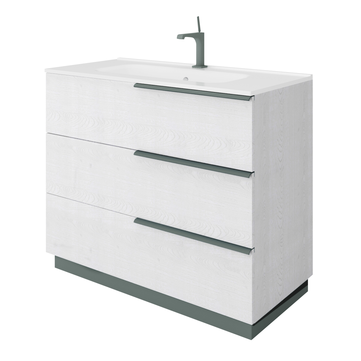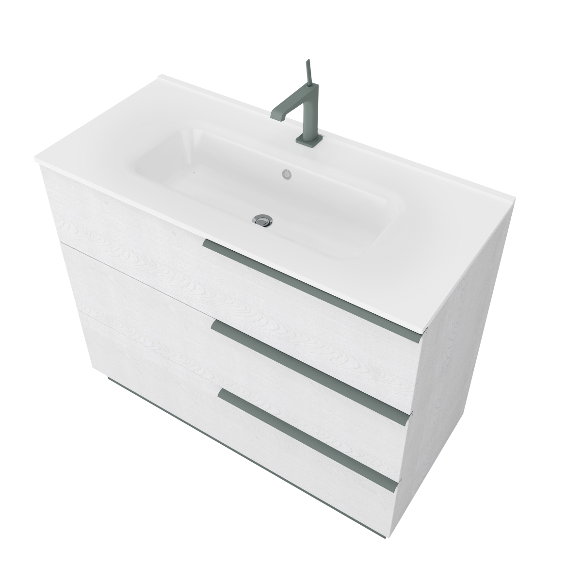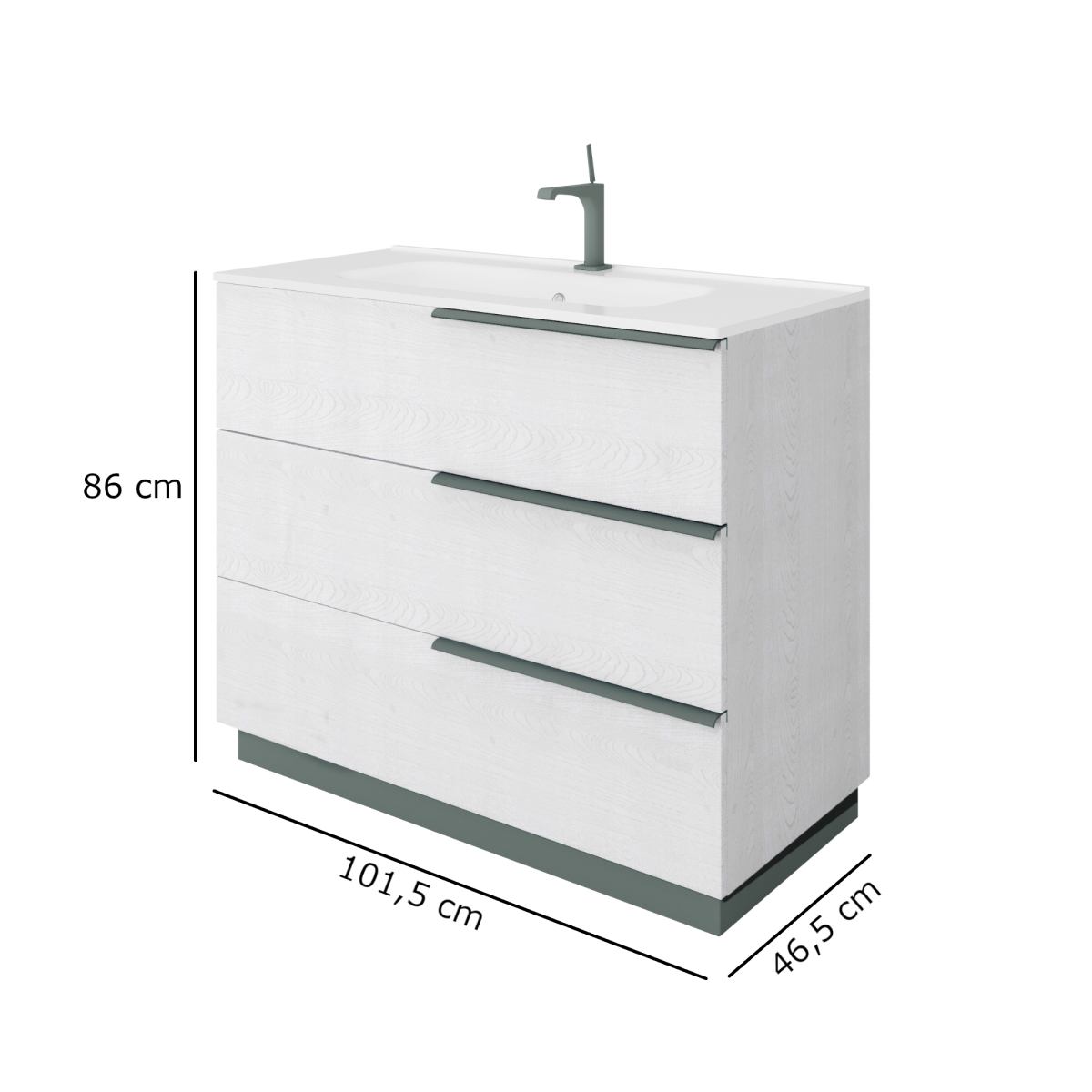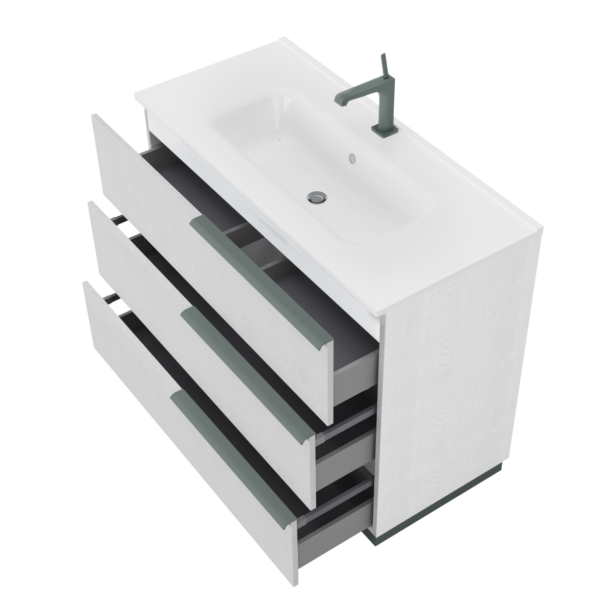 A három fiók bőséges helyet ad a napi eszközöknek, a felső kerámia mosdó pedig kényelmes, jól tisztítható felületet kínál. Álló kivitelének köszönhetően olyan helyeken is bevethető, ahol a falra szerelés nem megoldható.