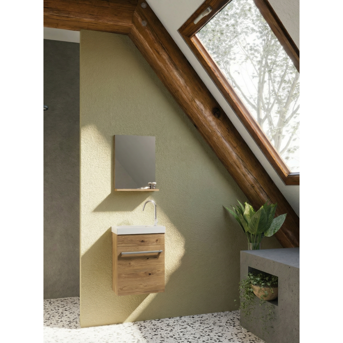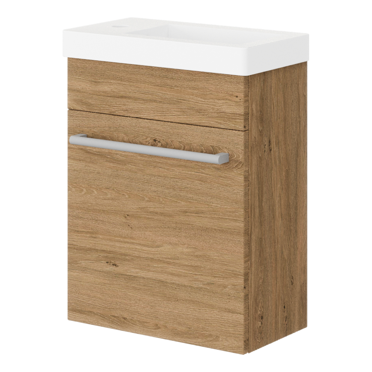 A Savini Perla-N függesztett alsószekrény mosdóval kompakt és praktikus választás kisebb fürdőszobákba vagy vendégmosdókba. A 42 cm széles kivitel helytakarékos megoldást kínál, miközben a természetes tölgy szín meleg, otthonos megjelenést ad a térnek. A körbezománcozott kerámia mosdónak köszönhetően jobbos és balos elrendezésben is beépíthető, így rugalmasan igazítható a helyiség adottságaihoz.