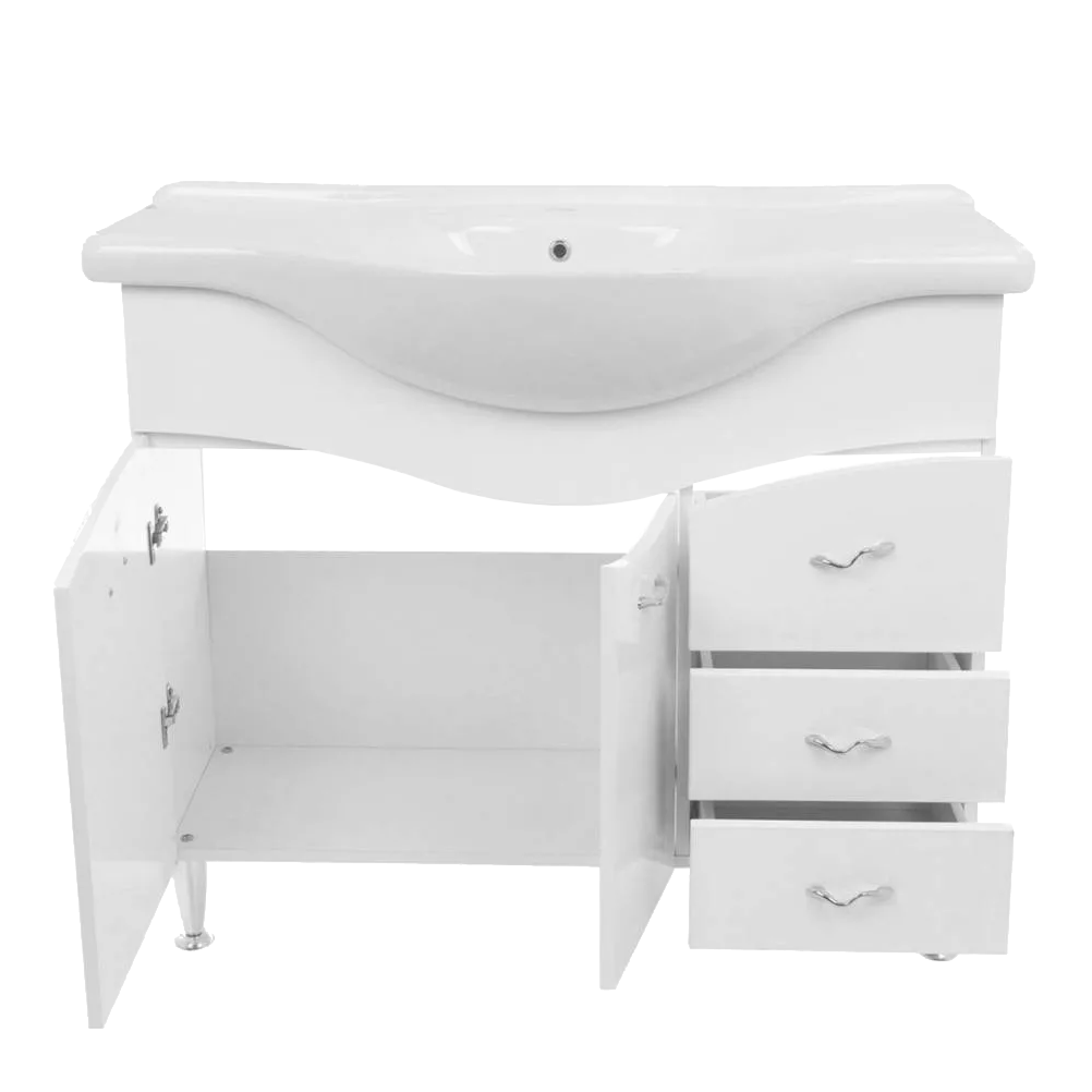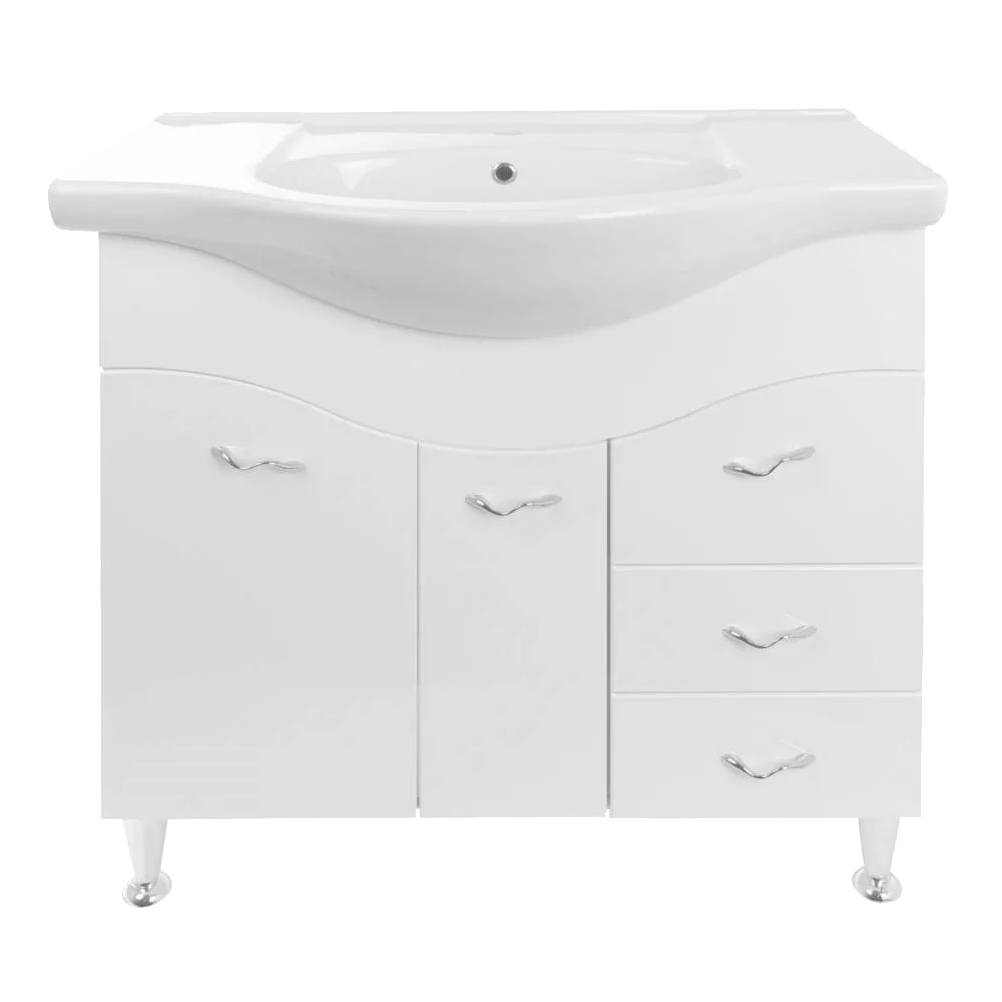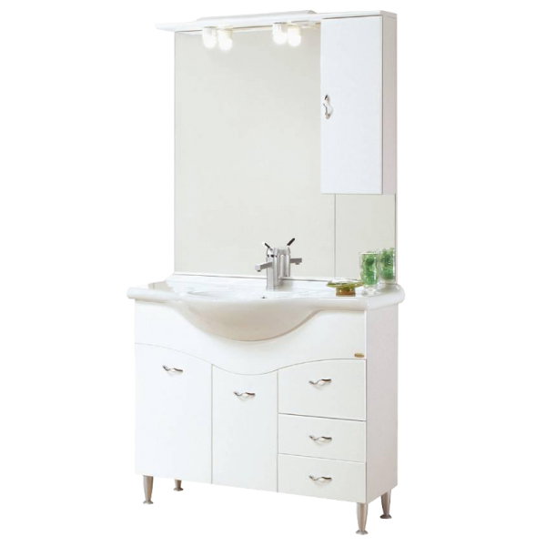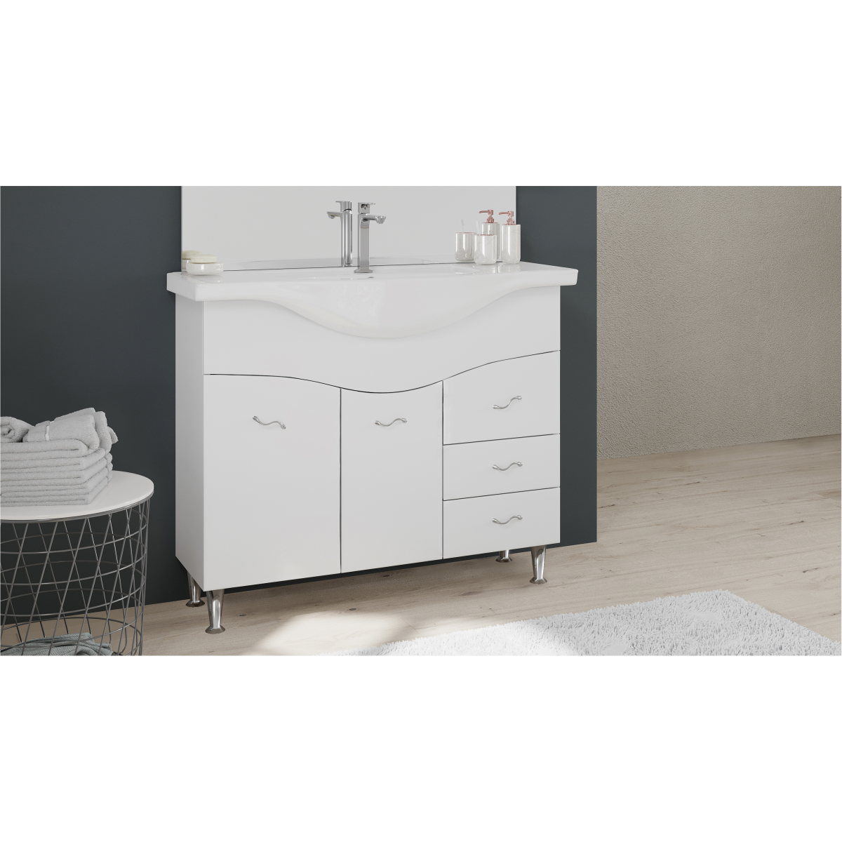 A Rimini 105 egy letisztult, fehér megjelenésű álló alsószekrény, amely harmonikus látványt nyújt a fehér kerámiamosdóval együtt.
