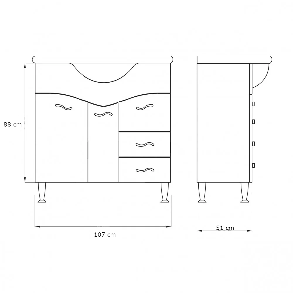 A három fiók és a kétajtós szekrény külön tárolási helyet biztosít a mindennapi eszközöknek, így könnyebb rendszerezni a fürdőszobai kellékeket. Az MDF és faforgácslap kombinációja egyszerű, sík felületeket ad, a szögletes vonalvezetés pedig visszafogottan illeszkedik sokféle stílushoz.