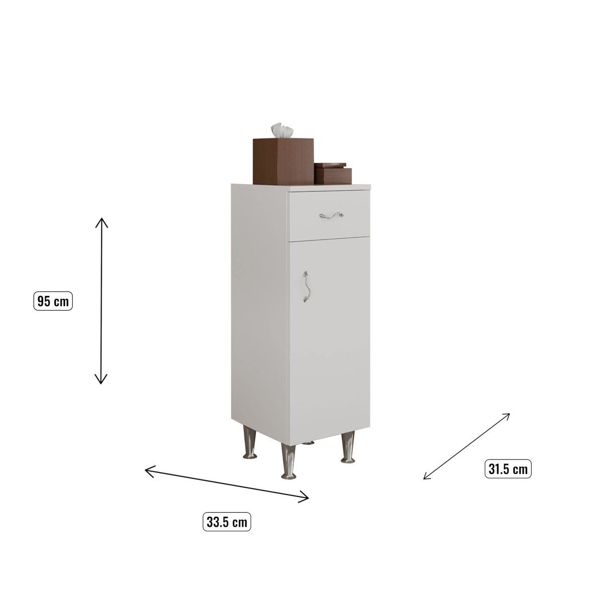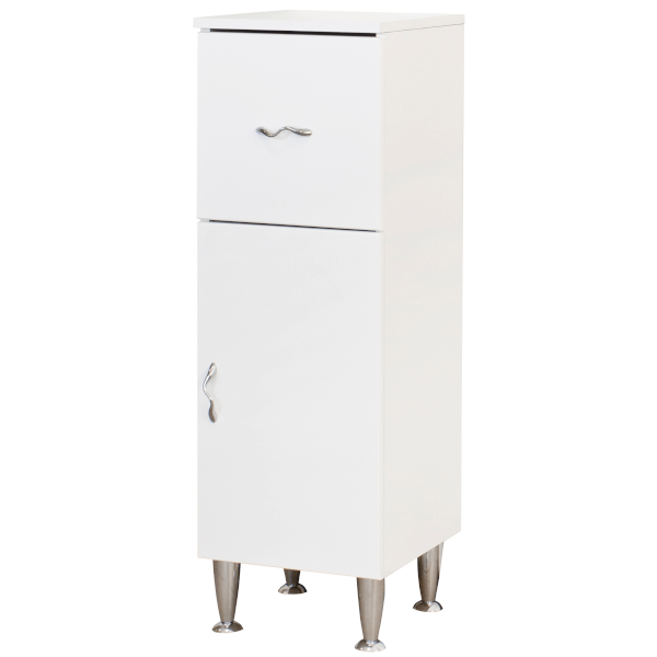 A szekrény 1 ajtóval és 1 fiókkal rendelkezik, belül egy polccal a kényelmes elrendezés érdekében. Jobbos vagy balos nyitásirányra is szerelhető, így könnyedén illeszthető a helyiség adottságaihoz.