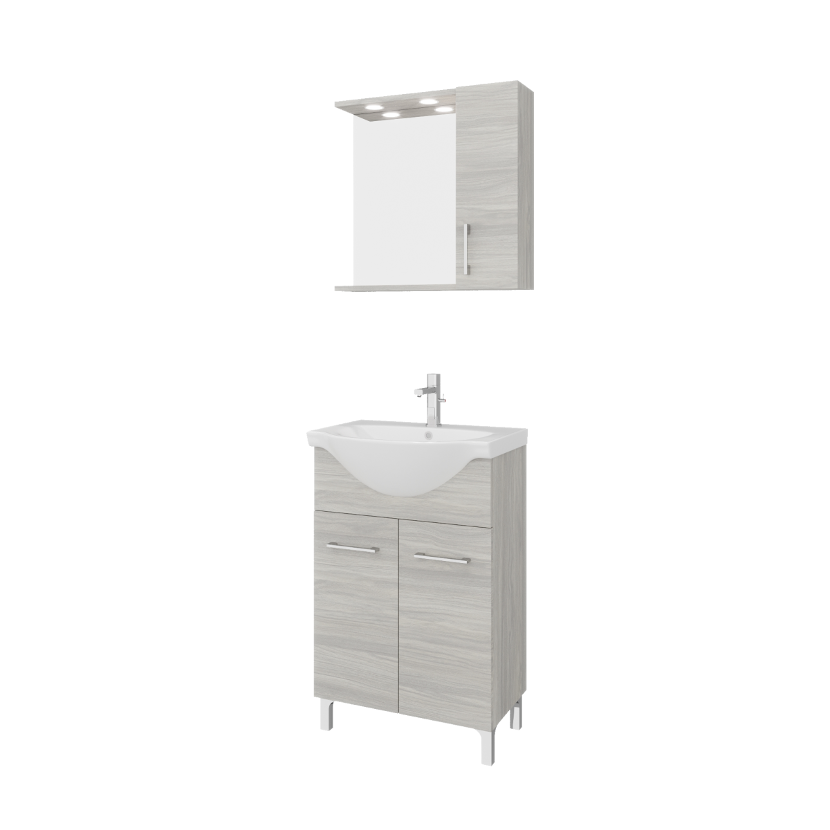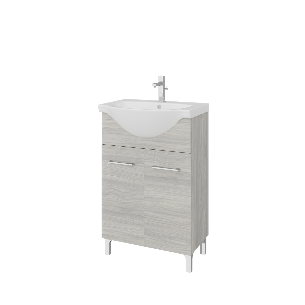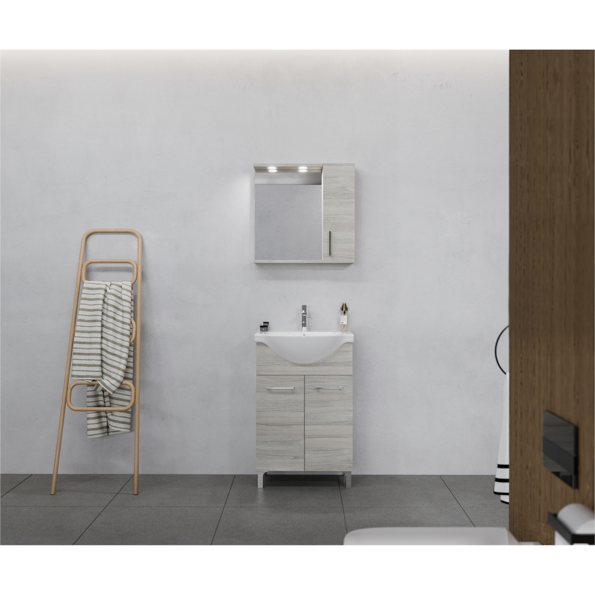 A Rubino 55 kompakt méretű, világosszürke fa hatású alsószekrény rendezetten illeszkedik kisebb fürdőszobákba.