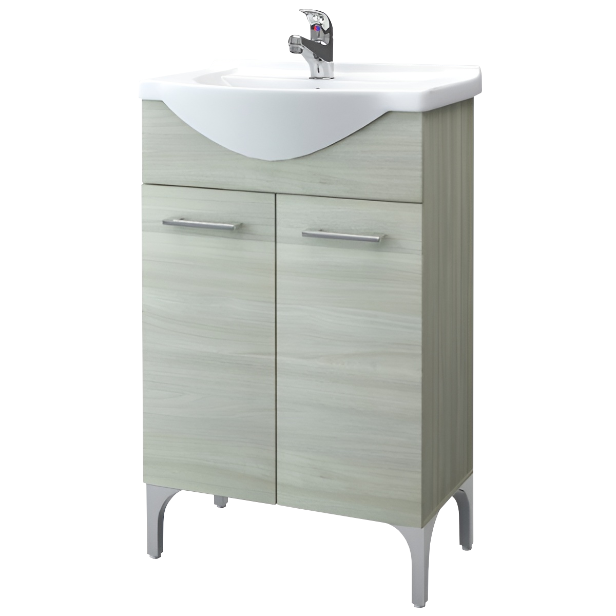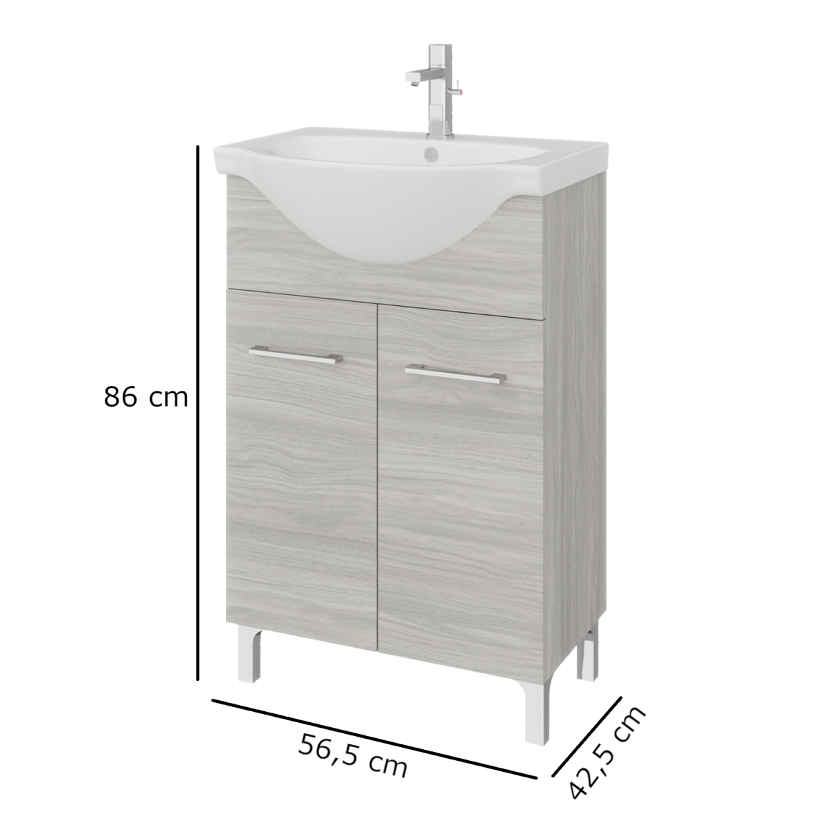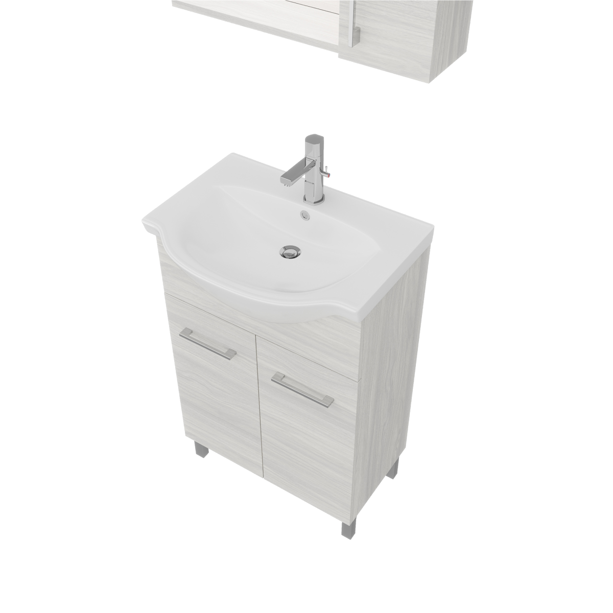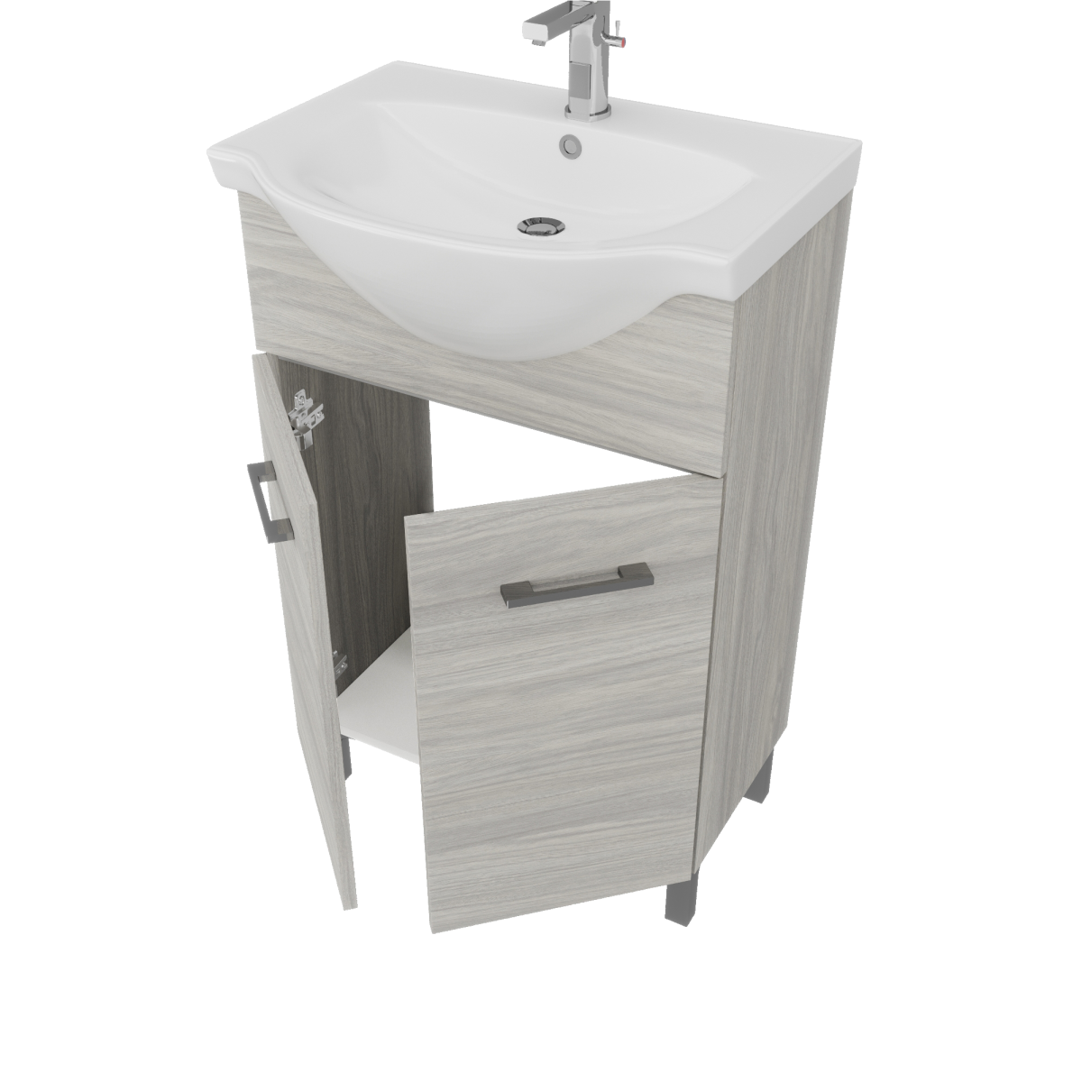 A Rubino 55 kompakt méretű, világosszürke fa hatású alsószekrény rendezetten illeszkedik kisebb fürdőszobákba.