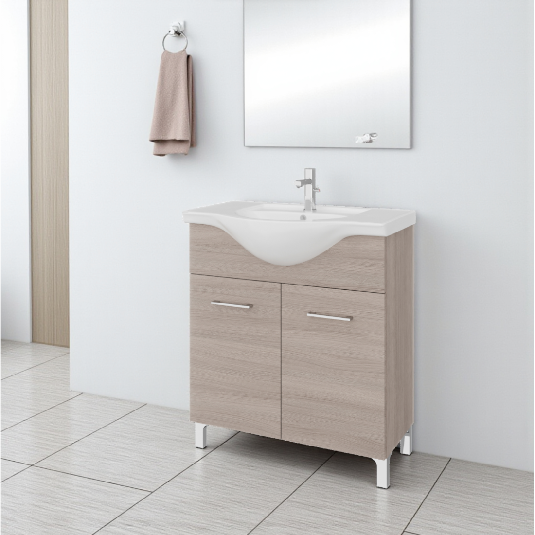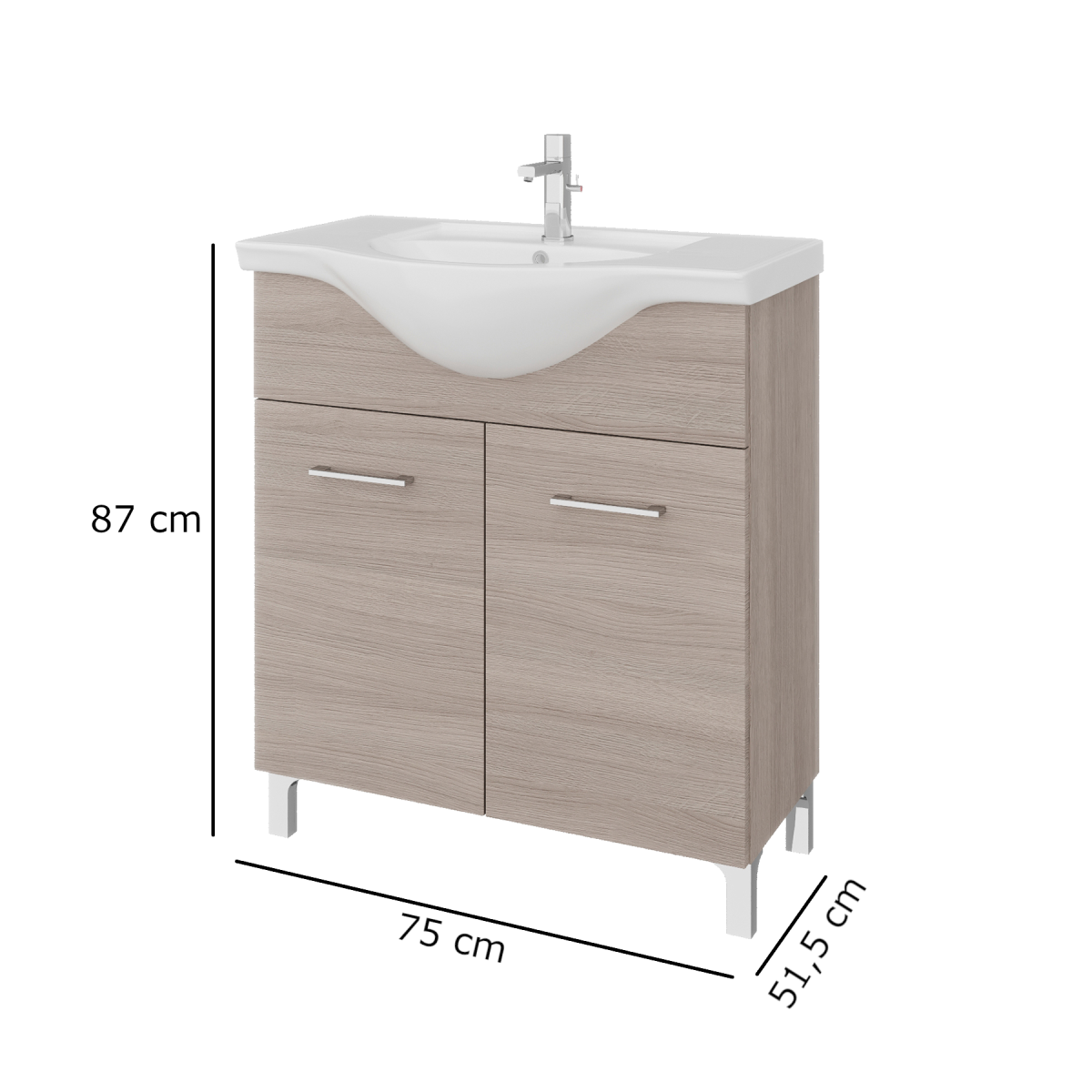 A 75 cm széles, fehér mosdó kényelmes mindennapi használatot nyújt, a kétajtós szekrény pedig segít külön helyet adni a tisztálkodási, kozmetikai és takarítási eszközöknek. Az álló kivitel stabil beállítást biztosít, könnyen illeszthető modern és klasszikus enteriőrbe egyaránt.