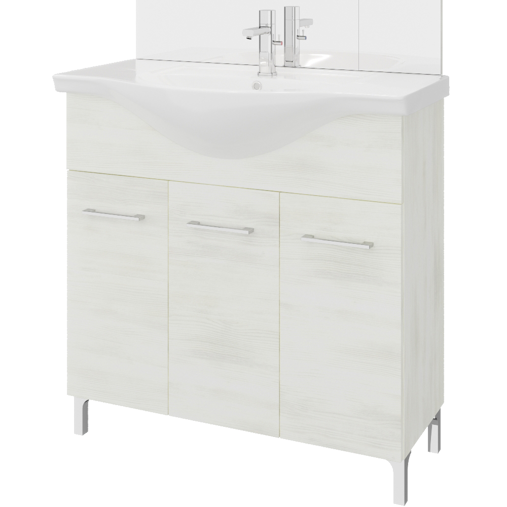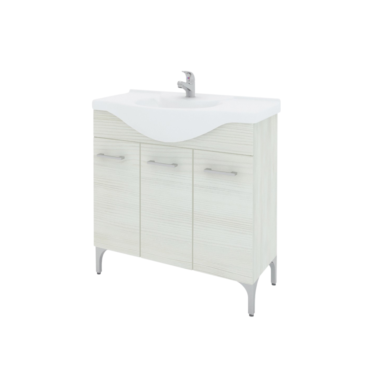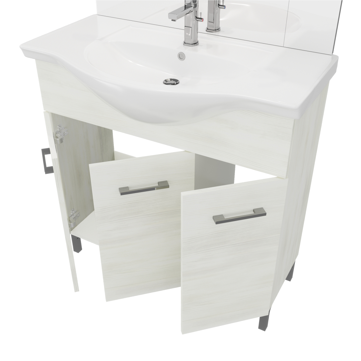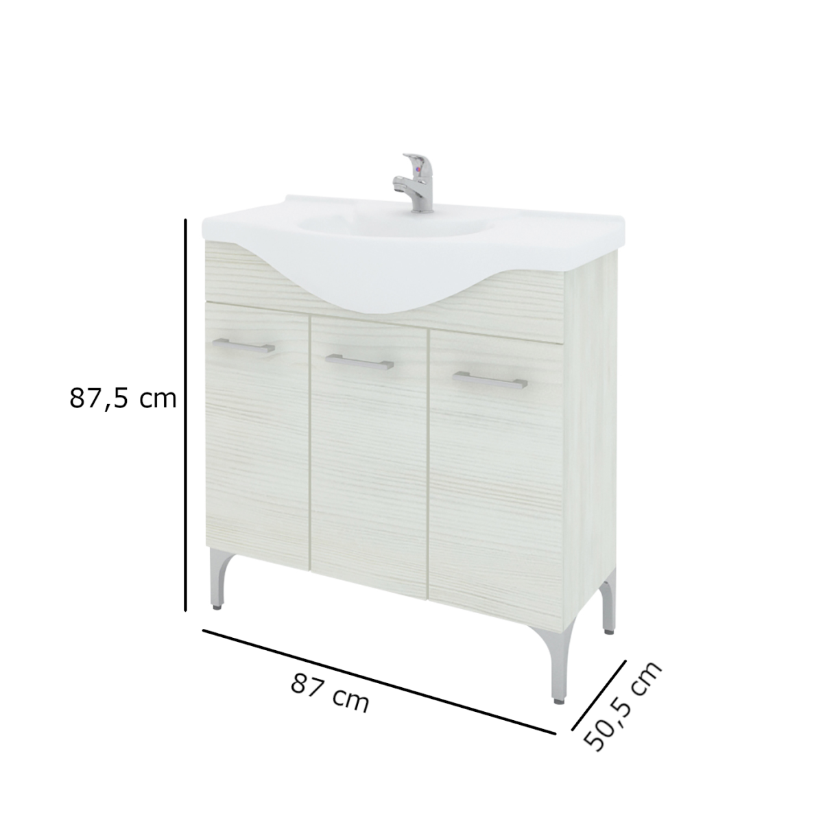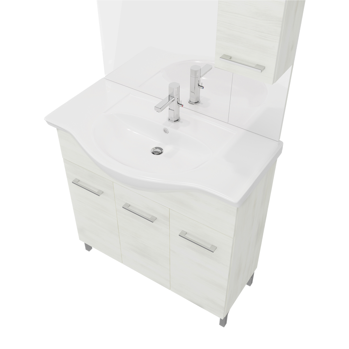 Az álló kivitel stabil elhelyezést nyújt, a 85 cm széles fehér kerámia mosdó pedig kényelmes használati felületet kínál a mindennapokban. A háromajtós, polcos belső elrendezés segít elkülönítve tárolni a szükséges eszközöket, így könnyebb rendet tartani és átláthatóbb marad a tér.