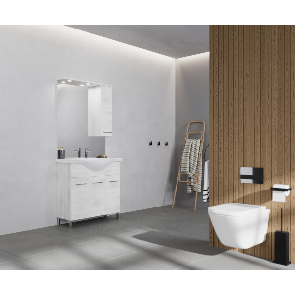 A Rubino 85 világos, fehér tölgy megjelenésével rendezett, barátságos hangulatot visz a fürdőszobába.