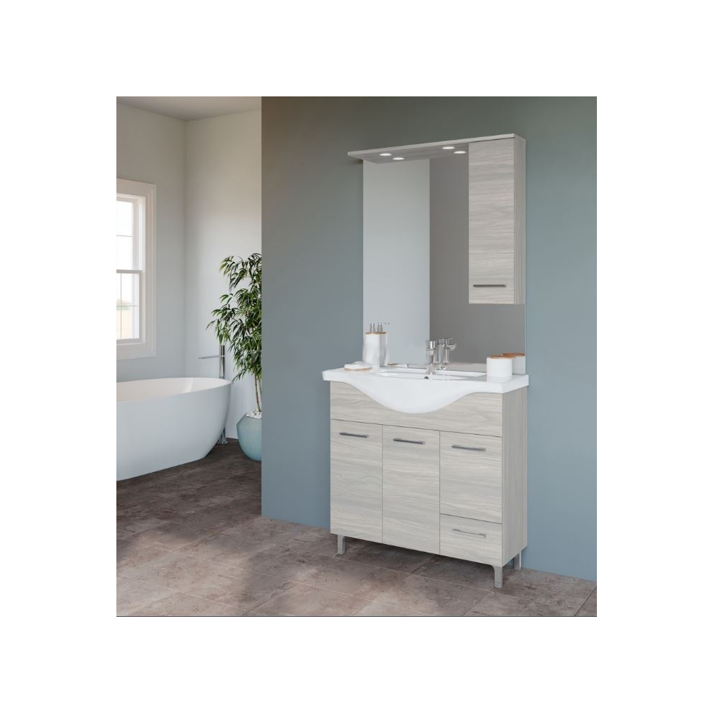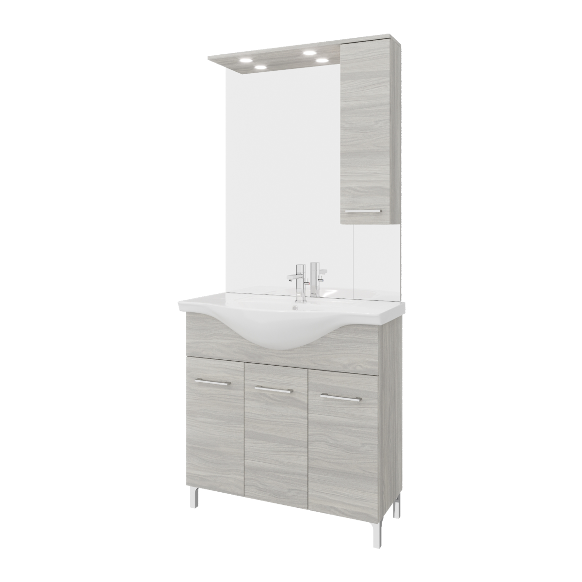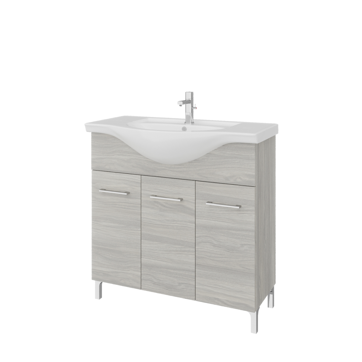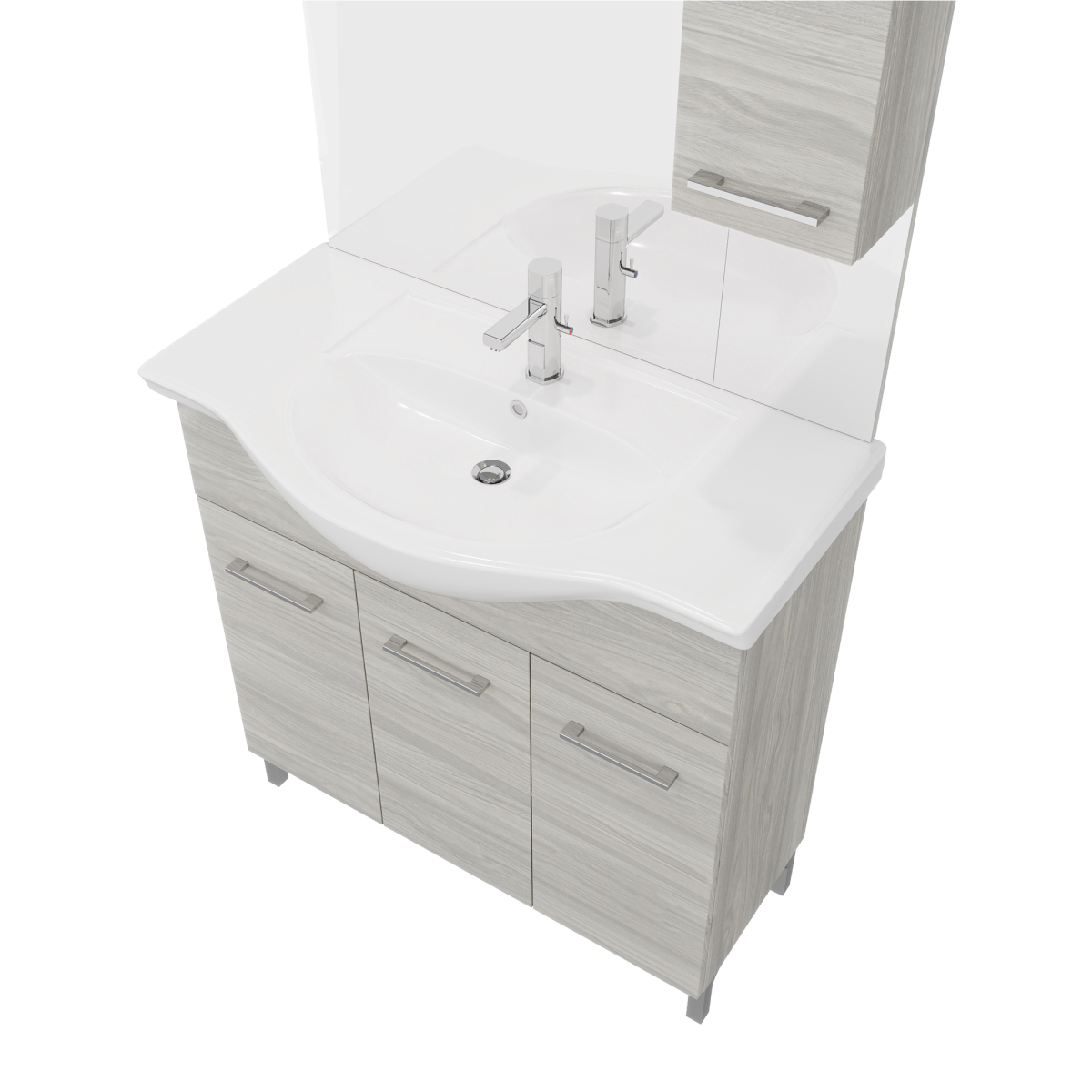 A Rubino 85 világosszürke, modern alsószekrény letisztult fehér, szögletes mosdóval érkezik, így harmonikus és praktikus párost alkotnak.