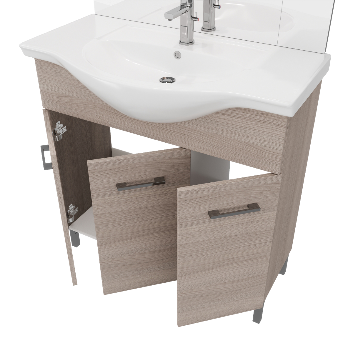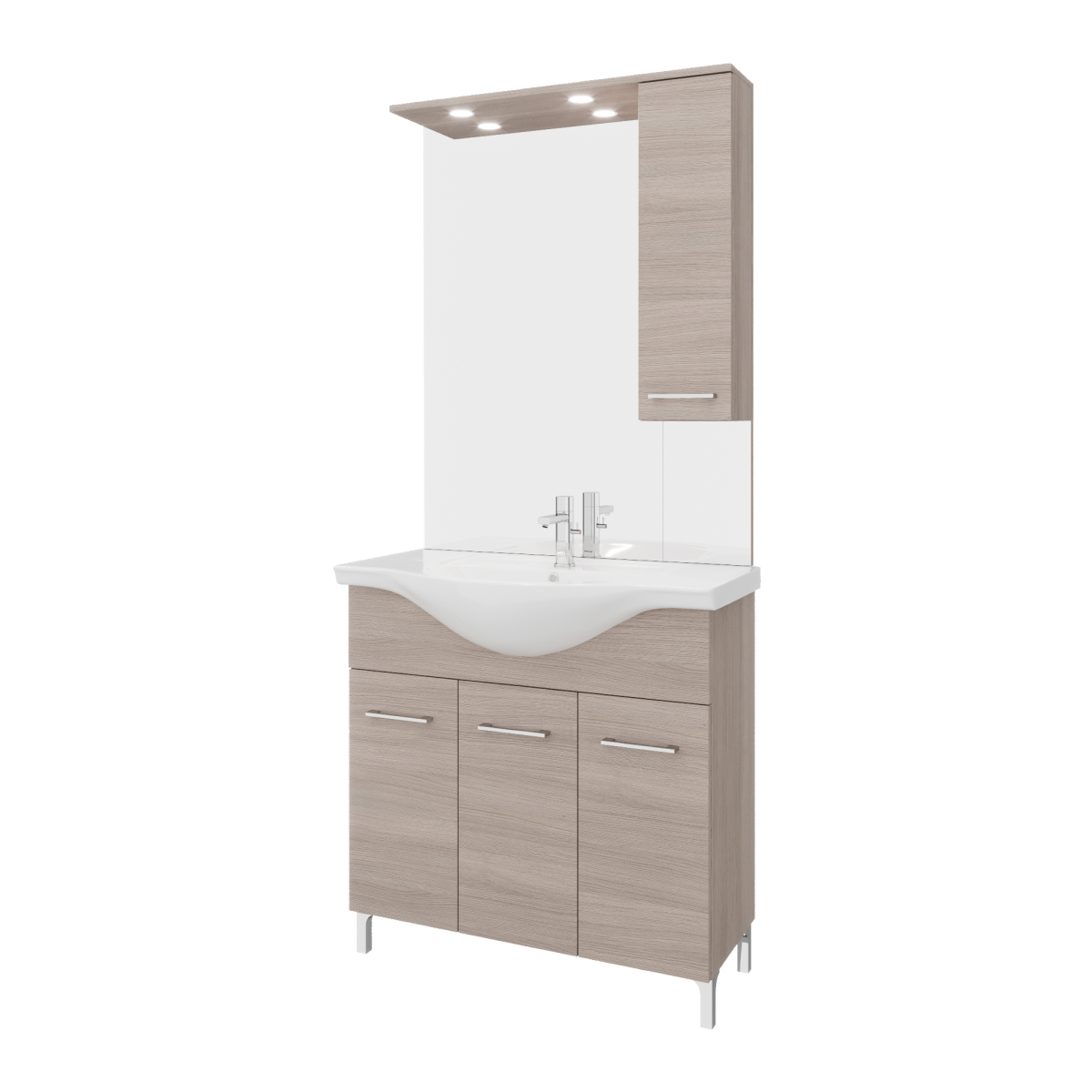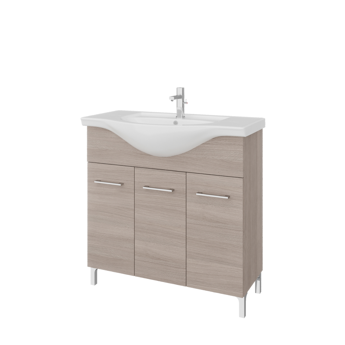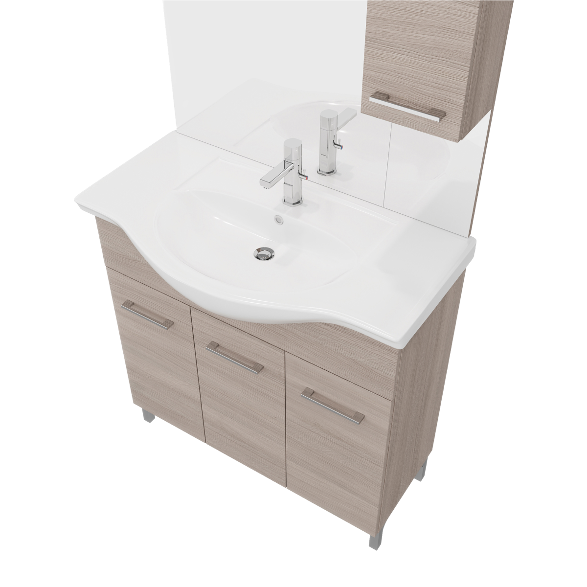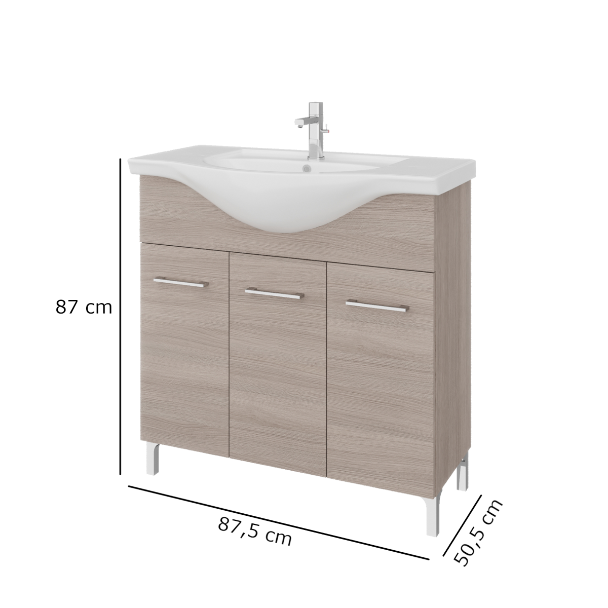 Az álló kivitel és a háromajtós tárolórész átlátható helyet ad a mindennapi fürdőszobai eszközöknek, a széles medence körüli perem pedig praktikus pakolófelületet kínál. A három külön nyíló ajtó segíti a rendszerezést, így elkülönítheted a textíliákat, tisztítószereket és kozmetikumokat.