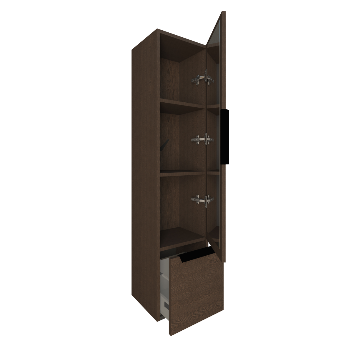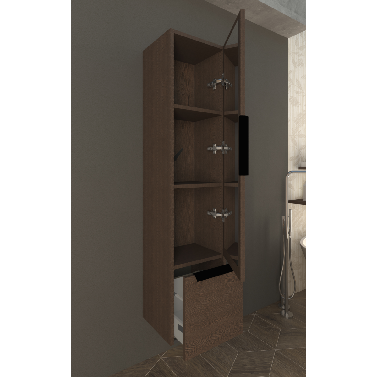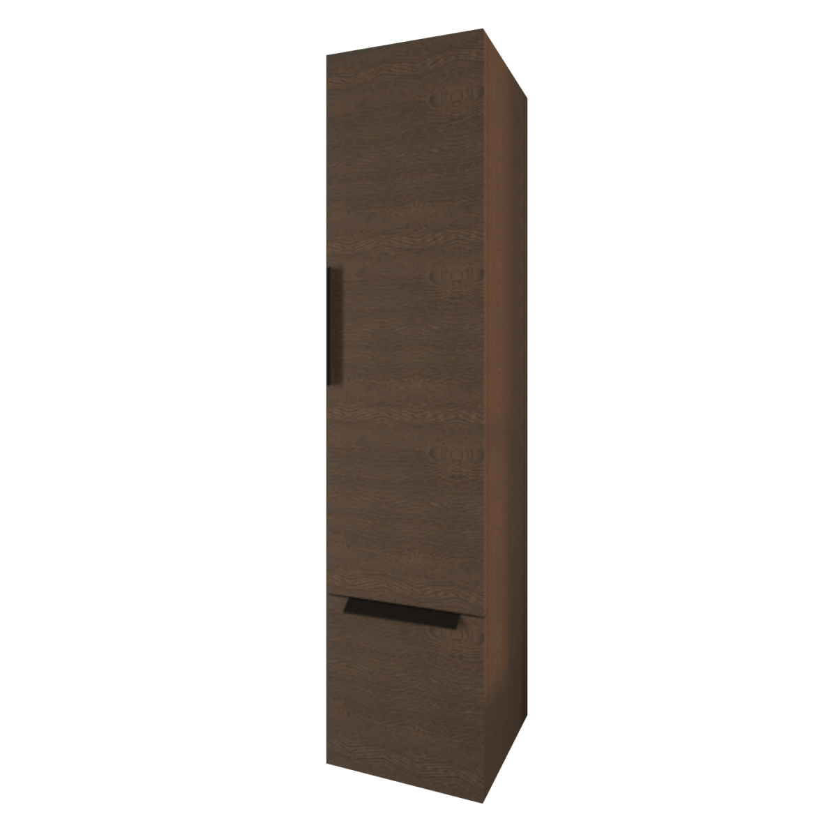 Ez a falra szerelhető, keskeny magasszekrény praktikus választás, ha rendezett tárolást és egységes megjelenést szeretnél a fürdőszobában. A sötét kőris szín elegánsan illeszkedik világos és sötétebb burkolatokhoz is, a függesztett kialakítás pedig megkönnyíti a takarítást a bútor alatt.