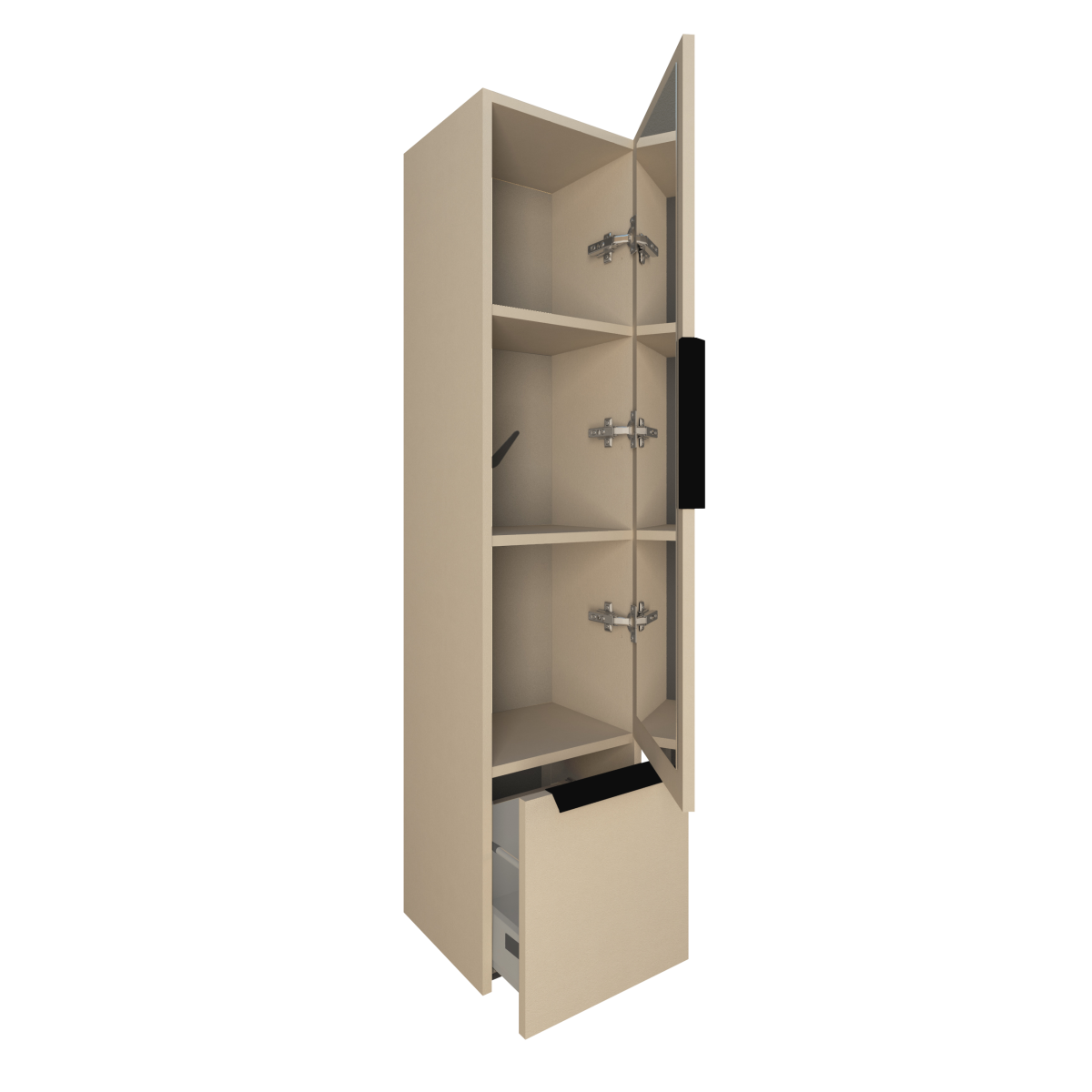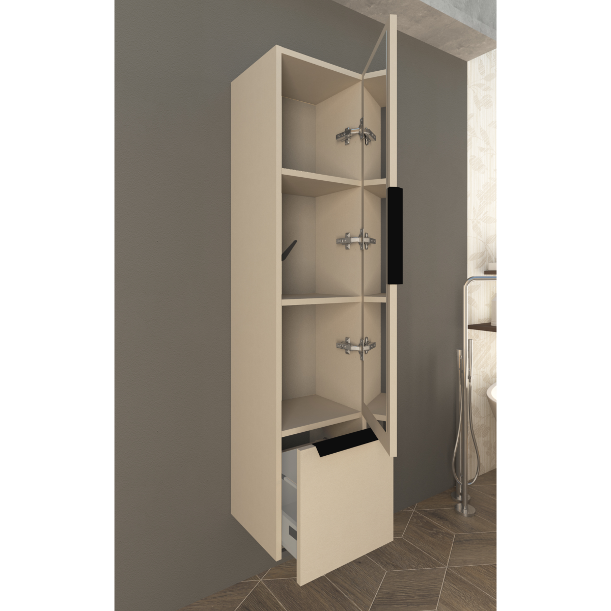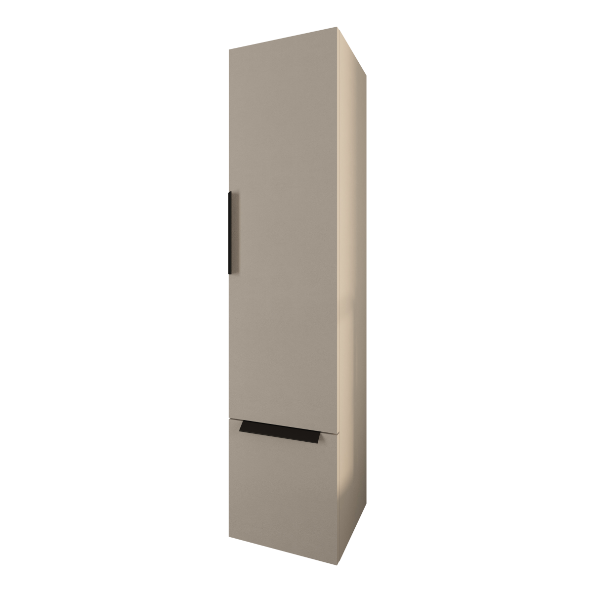 Falra szerelhető, keskeny magasszekrény, amely rendezett tárolást ad a fürdőszobában anélkül, hogy sok helyet foglalna. A tört fehér front visszafogott, könnyen kombinálható megjelenést ad, a függesztett kivitel pedig megkönnyíti a takarítást a bútor alatt.