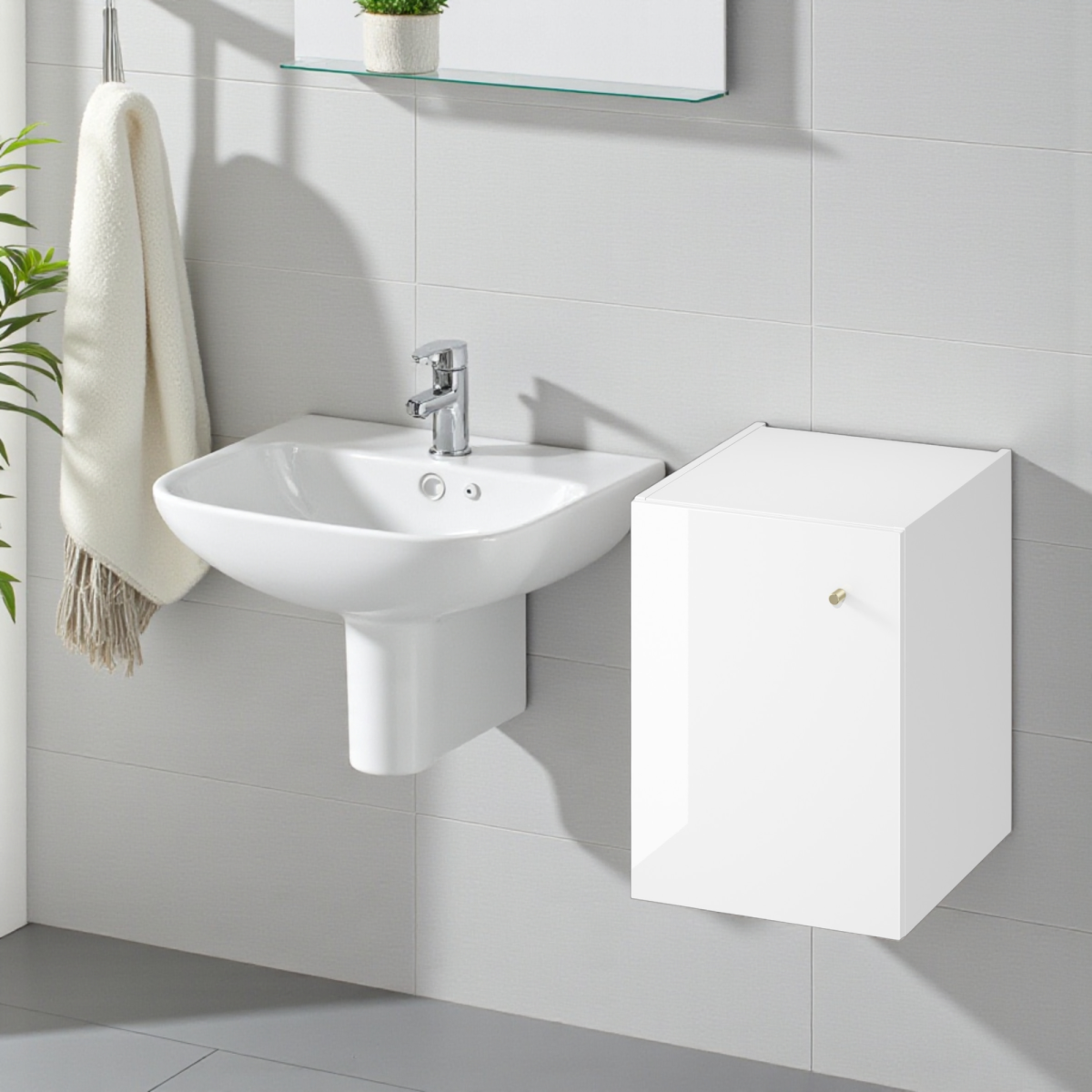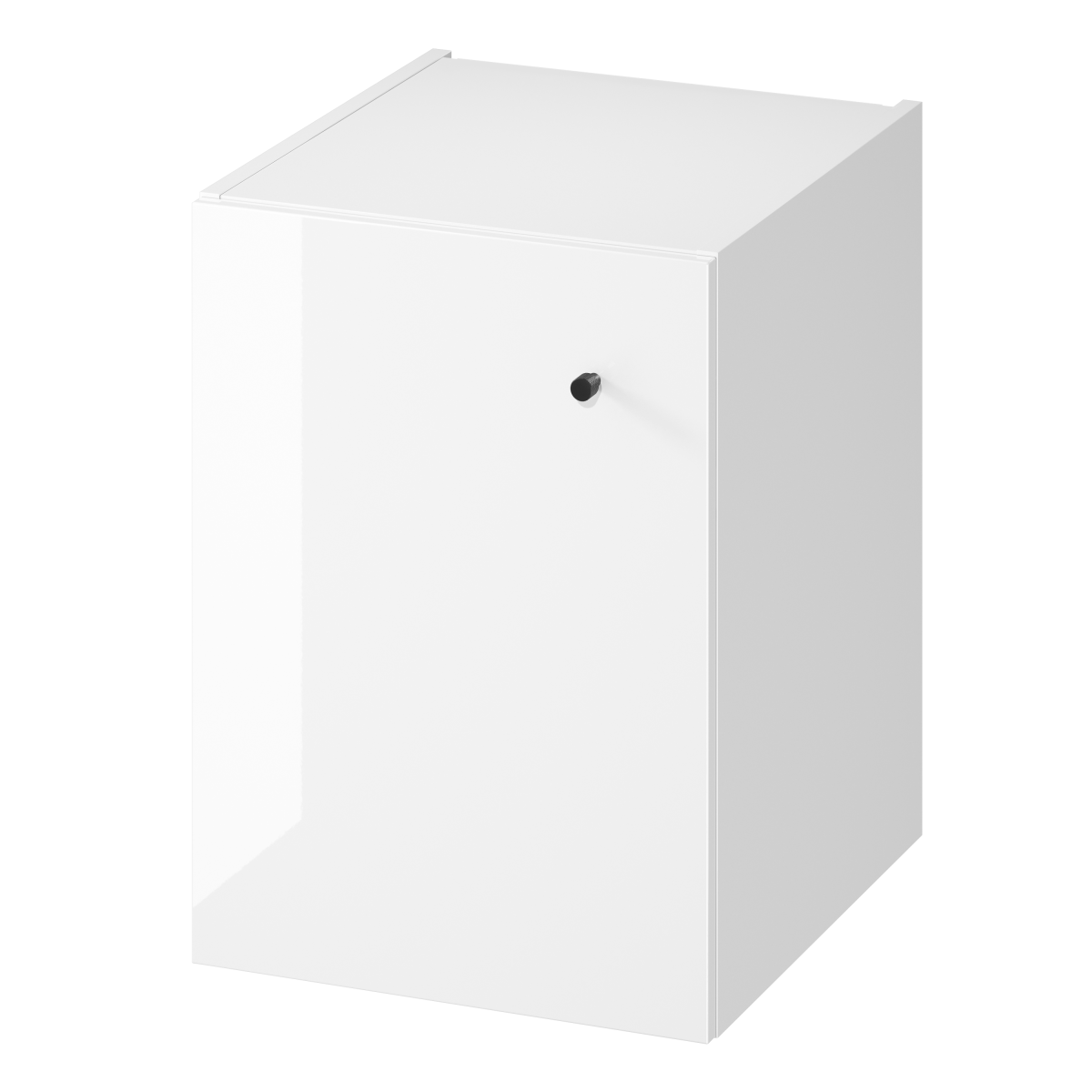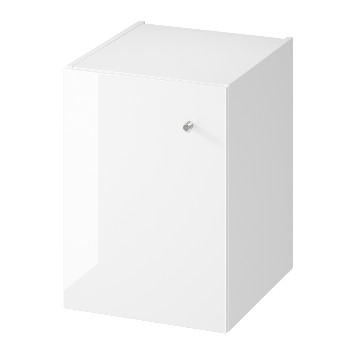 A bútor lakkozott forgácslapból készült, amely fehér, fényes felületével időtálló megjelenést és könnyű tisztíthatóságot biztosít. Az ajtó lágy záródású (soft-close) pántokkal van szerelve, így halk és kíméletes működést tesz lehetővé. A belső részben egy polc található, amely megkönnyíti a piperecikkek, tisztítószerek vagy kisebb tárgyak rendszerezését.