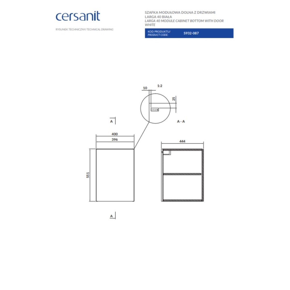 A Cersanit Larga fehér alsószekrény a letisztult dizájn és a praktikus funkcionalitás tökéletes kombinációja. A 44,4 cm széles, 55,1 cm magas és 40 cm mély függesztett szekrény ideális választás a modern, rendezett fürdőszobákhoz, és jól illeszkedik a Cersanit Larga kollekció többi eleméhez.