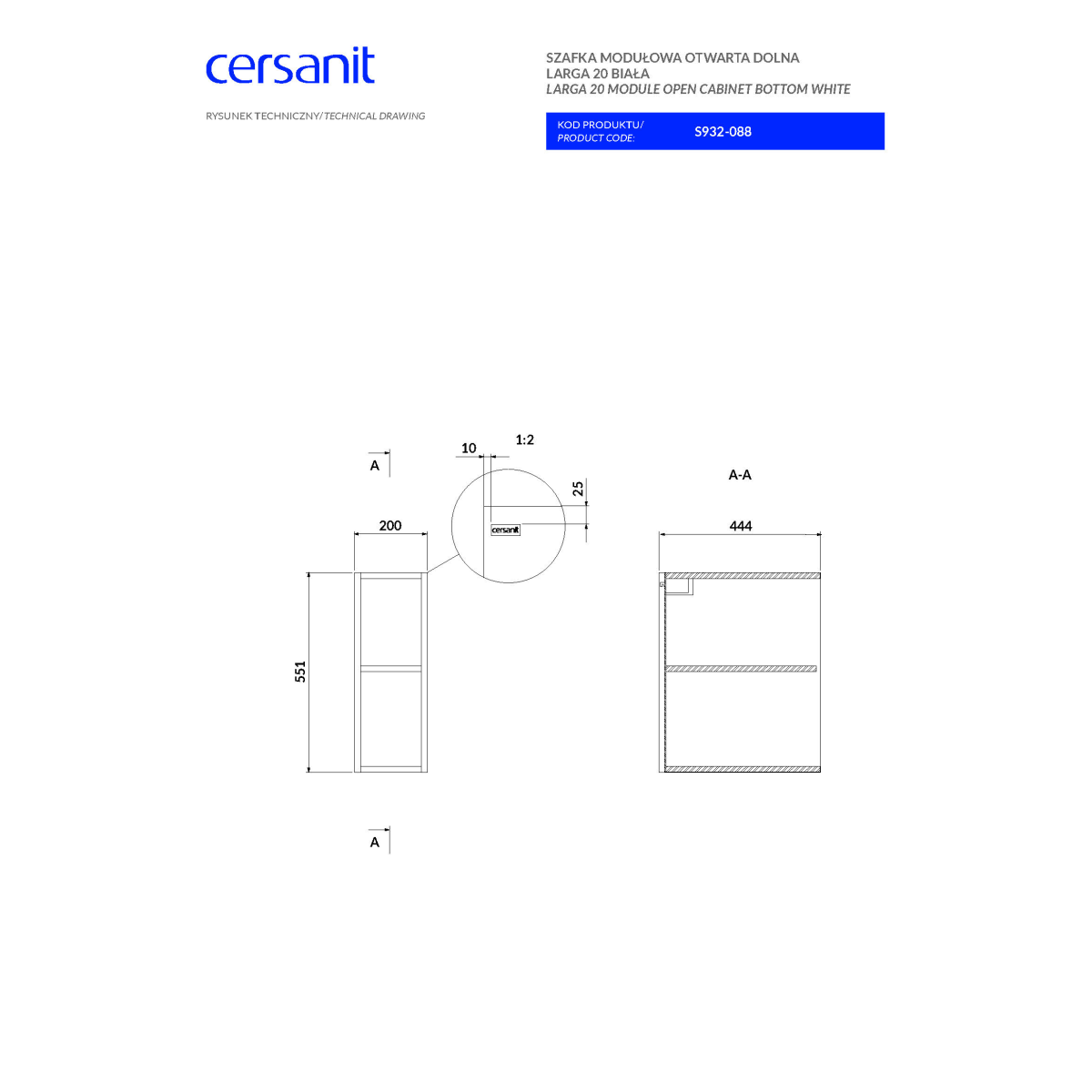 - Cersanit Larga fehér 20 cm x 55,1 cm x 44,4 cm-es nyitott alsószekrény