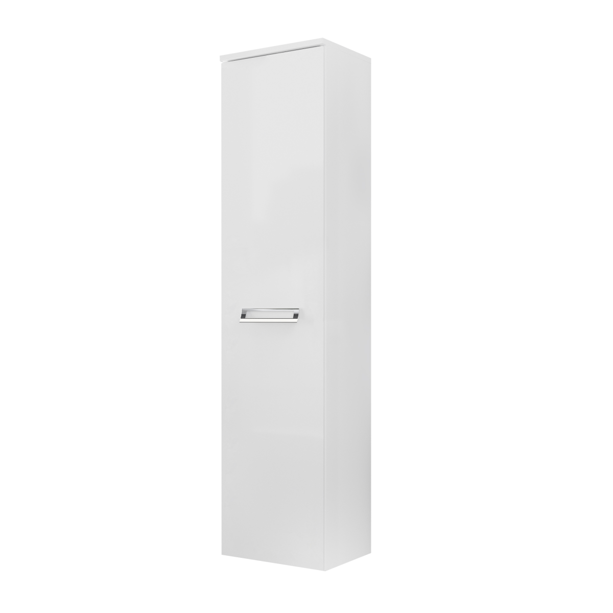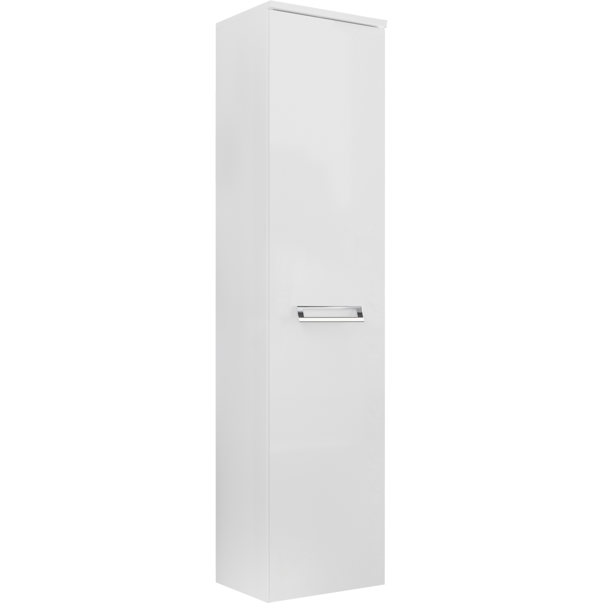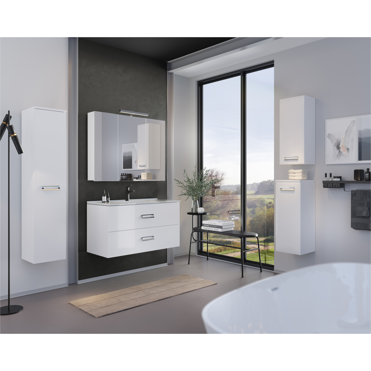 A Fly fali magasszekrény modern, magasfényű fehér felülete rendezett, világos hatást ad a fürdőszobának.