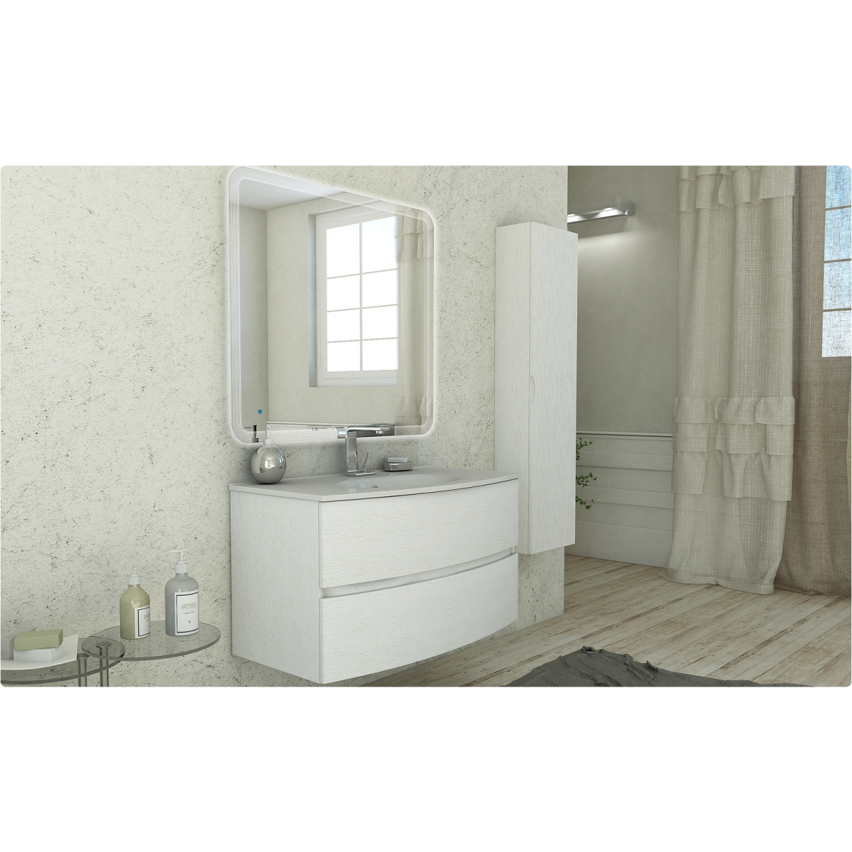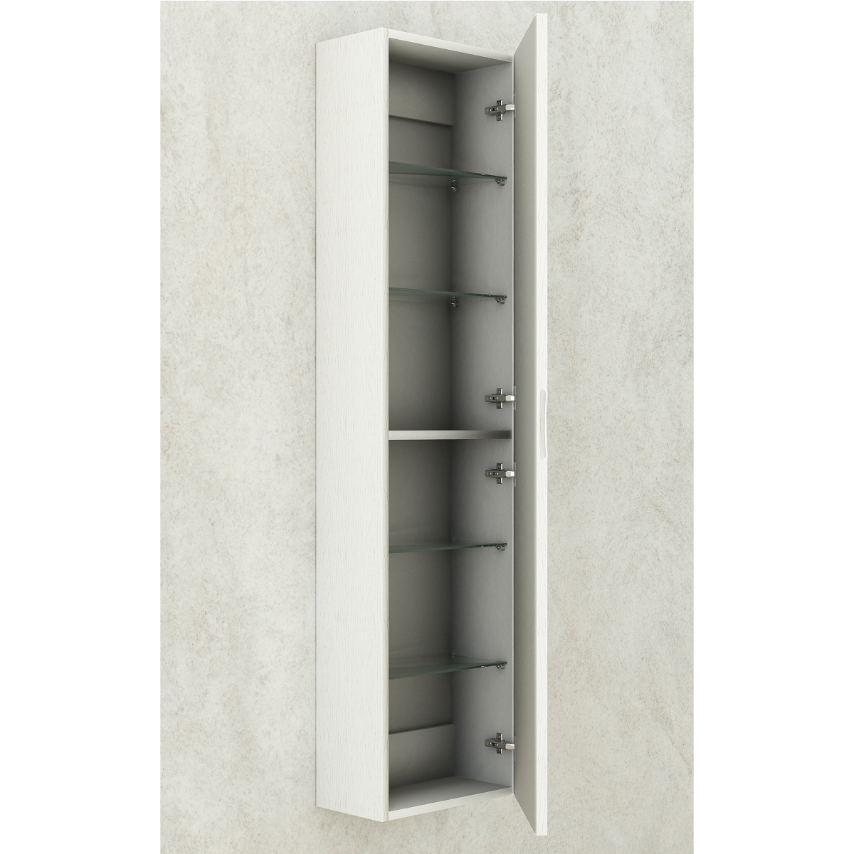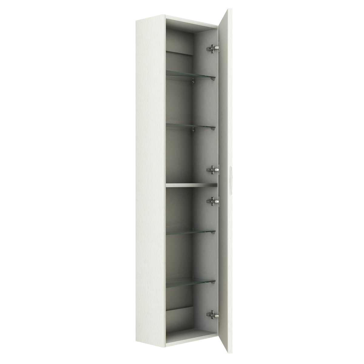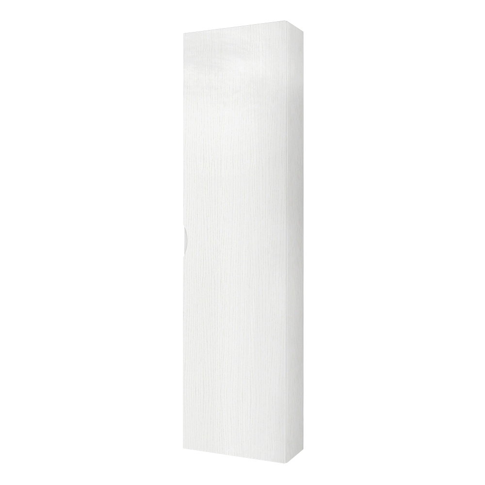 Keskeny, helytakarékos tároló modern fehér kőris színben. A mélyített fogantyú letisztult megjelenést és kényelmes nyitást ad – kis alapterületen is rendezett tárolást biztosít.